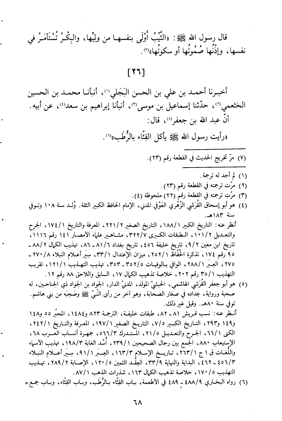 26 - أخبرنَا أَحْمد بن عَليّ بن الْحسن البَجلِيّ أَنبأَنَا مُحَمَّد بن الْحُسَيْن الْخَثْعَمِي حَدثنَا إِسْمَاعِيل بن مُوسَى أَنبأَنَا إِبْرَاهِيم بن سعد عَن أَبِيه أَن عبد الله بن جَعْفَر قَالَ
