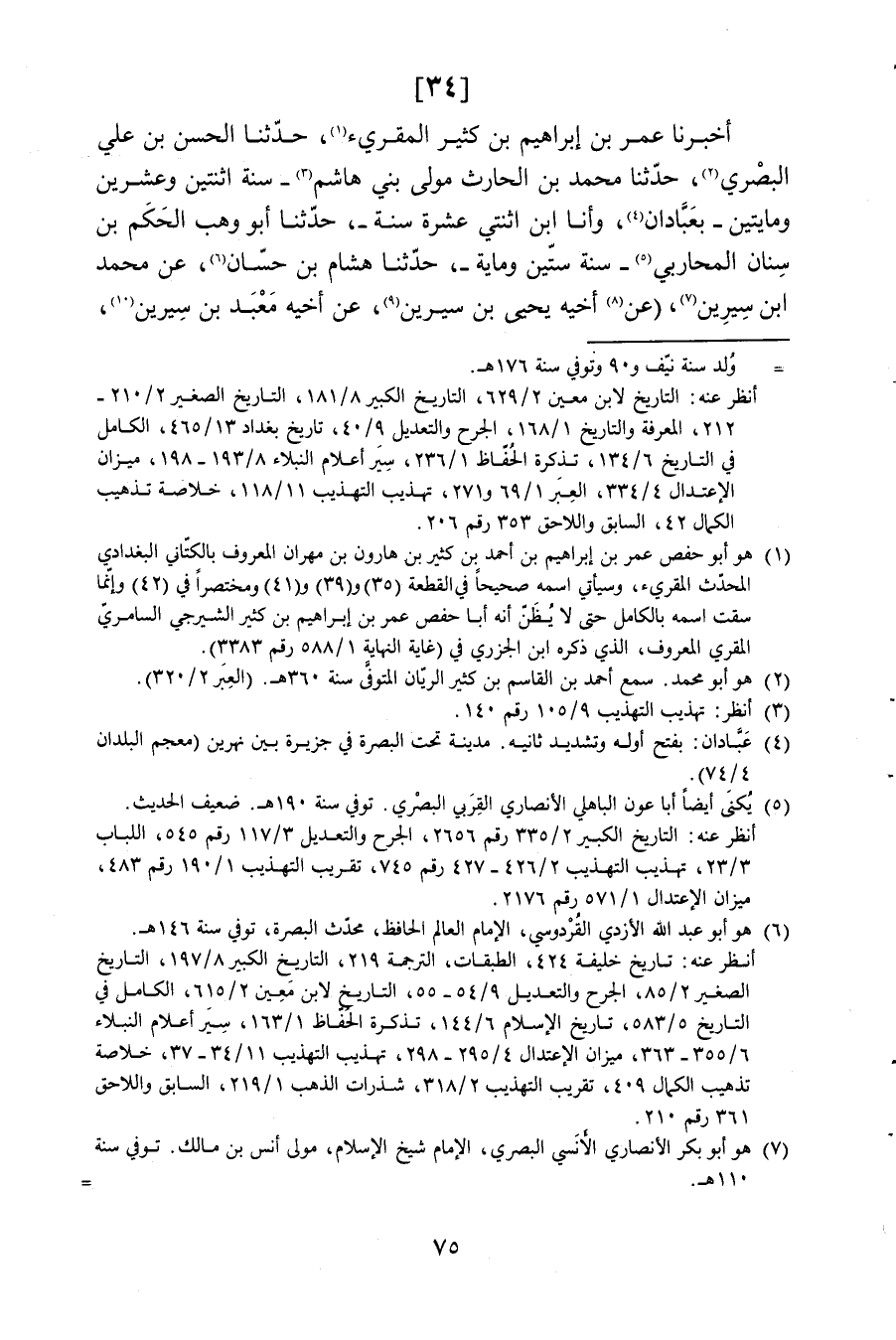 34 - أخبرنَا عمر بن إِبْرَاهِيم بن كثير المقريء حَدثنَا الْحسن بن عَليّ الْبَصْرِيّ حَدثنَا مُحَمَّد بن الْحَارِث مولى بني هَاشم سنة اثْنَتَيْنِ وَعشْرين ومايتين بعبادان وَأَنا ابْن اثْنَتَيْ عشرَة سنة حَدثنَا أَبُو وهب الحكم بن سِنَان الْمحَاربي سنة سِتِّينَ وماية حَدثنَا هِشَام بن حسان عَن مُحَمَّد ابْن سِيرِين عَن أَخِيه يحيى بن سِيرِين عَن أَخِيه معبد بن سِيرِين عَن أَخِيه أنس بن سِيرِين عَن أنس بن مَالك قَالَ