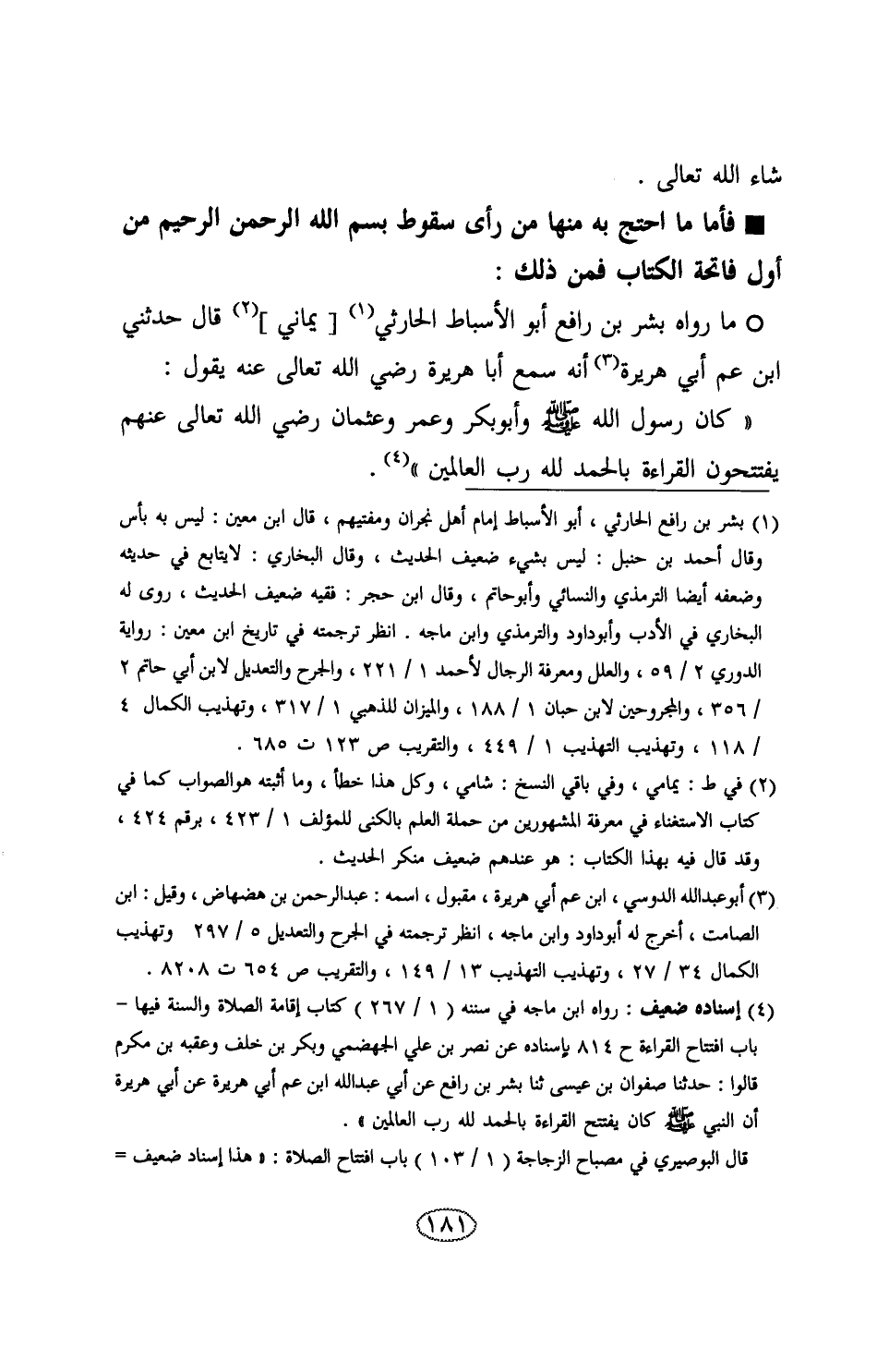 مَا رَوَاهُ بِشْرُ بْنُ رَافِعٍ أَبُو الْأَسْبَاطِ الْحَارِثِيُّ يَمَانِيٌّ , قَالَ: حَدَّثَنِي ابْنُ عَمِّ أَبِي هُرَيْرَةَ أَنَّهُ سَمِعَ أَبَا هُرَيْرَةَ رَضِيَ اللَّهُ تَعَالَى عَنْهُ يَقُولُ: كَانَ رَسُولُ اللَّهِ صَلَّى اللهُ عَلَيْهِ وَسَلَّمَ , وَأَبُو بَكْرٍ , وَعُمَرُ , وَعُثْمَانُ رَضِيَ اللَّهُ تَعَالَى عَنْهُمْ §يَفْتَتِحُونَ الْقِرَاءَةَ بِـ {الْحَمْدُ لِلَّهِ رَبِّ الْعَالَمِينَ} [الفاتحة: 2]-[182]- وَبِشْرُ بْنُ رَافِعٍ عِنْدَهُمْ مُنْكَرُ الْحَدِيثِ قَدِ اتَّفَقُوا عَلَى إِنْكَارِ حَدِيثِهِ , وَطَرْحِ مَا رَوَاهُ وَتَرْكِ الِاحْتِجَاجِ بِهِ لَا يَخْتَلِفُ عُلَمَاءُ الْحَدِيثِ فِي ذَلِكَ , وَالَّذِينَ يَرْوُونَ عَنْ بِشْرِ بْنِ رَافِعٍ: حَاتِمُ بْنُ إِسْمَاعِيلَ , وَعَبْدُ الرَّزَّاقِ , وَصَفْوَانُ بْنُ عِيسَى , وَلَوْ صَحَّ حَدِيثُهُ احْتَمَلَ مِنَ التَّأْوِيلِ مَا ذَكَرْنَا فِي حَدِيثِ عَائِشَةَ رَضِيَ اللَّهُ تَعَالَى عَنْهَا قَبْلَ هَذَا وَرَوَاهُ عَبْدُ الْوَاحِدِ بْنُ زِيَادٍ , عَنْ عُمَارَةَ بْنِ الْقَعْقَاعِ , عَنْ أَبِي زُرْعَةَ , عَنْ أَبِي هُرَيْرَةَ -[183]-: أَنَّ رَسُولَ اللَّهِ صَلَّى اللهُ عَلَيْهِ وَسَلَّمَ كَانَ إِذَا نَهَضَ فِي الثَّانِيَةِ اسْتَفْتَحَ بِـ الْحَمْدُ لِلَّهِ رَبِّ الْعَالَمِينَ وَلَمْ يَسْكُتْ وَهَذِهِ رِوَايَةٌ يُغْنِي ظَاهِرُهَا عَنِ الْكَلَامِ فِيهَا , وَفِيهَا دَلِيلٌ عَلَى أَنَّهُ كَانَ يَسْكُتُ بَعْدَ التَّكْبِيرِ فِي الْأُولَى عَلَى مَا رَوَاهُ سَمُرَةُ وَمِنْهَا حَدِيثُ الْعَلَاءِ بْنِ عَبْدِ الرَّحْمَنِ: وَهُوَ أَصَحُّ حَدِيثٍ رُوِيَ فِي سُقُوطِ بِسْمِ اللَّهِ الرَّحْمَنِ الرَّحِيمِ مِنْ أَوَّلِ فَاتِحَةِ الْكِتَابِ وَأَبْيَنُهُ وَأَبْعَدُهُ مِنَ -[184]- احْتِمَالِ التَّأْوِيلِ: