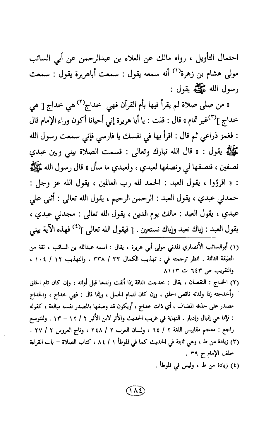 رَوَاهُ مَالِكٌ عَنِ الْعَلَاءِ بْنِ عَبْدِ الرَّحْمَنِ , عَنْ أَبِي السَّائِبِ مَوْلَى هِشَامِ بْنِ زُهْرَةَ أَنَّهُ سَمِعَهُ يَقُولُ: سَمِعْتُ أَبَا هُرَيْرَةَ يَقُولُ: سَمِعْتُ رَسُولَ اللَّهِ صَلَّى اللهُ عَلَيْهِ وَسَلَّمَ يَقُولُ: «مَنْ صَلَّى صَلَاةً لَمْ يَقْرَأْ فِيهَا بِأُمِّ الْقُرْآنِ فَهِيَ خِدَاجٌ , هِيَ خِدَاجٌ , هِيَ خِدَاجٌ غَيْرُ تَمَامٍ» قَالَ: قُلْتُ: يَا أَبَا هُرَيْرَةَ , إِنِّي أَحْيَانًا أَكُونُ وَرَاءَ الْإِمَامِ قَالَ: فَغَمَزَ ذِرَاعِي ثُمَّ قَالَ: اقْرَأْ بِهَا فِي نَفْسِكَ يَا فَارِسِيُّ فَإِنَّى سَمِعْتُ رَسُولَ اللَّهِ صَلَّى اللهُ عَلَيْهِ وَسَلَّمَ يَقُولُ: " قَالَ اللَّهُ تَبَارَكَ وَتَعَالَى: §قَسَمْتُ الصَّلَاةَ بَيْنِي وَبَيْنَ عَبْدِي نِصْفَيْنِ , فَنِصْفُهَا لِي وَنِصْفُهَا لِعَبْدِي , وَلِعَبْدِي مَا سَأَلَ " قَالَ رَسُولُ اللَّهِ صَلَّى اللهُ عَلَيْهِ وَسَلَّمَ: " اقْرَءُوا , يَقُولُ الْعَبْدُ: {الْحَمْدُ لِلَّهِ رَبِّ الْعَالَمِينَ} [الفاتحة: 2] يَقُولُ اللَّهُ عَزَّ وَجَلَّ: حَمِدَنِي عَبْدِي , يَقُولُ الْعَبْدُ: {الرَّحْمَنِ الرَّحِيمِ} [الفاتحة: 1] , يَقُولُ اللَّهُ تَعَالَى: أَثْنَى عَلَيَّ عَبْدِي , يَقُولُ الْعَبْدُ: {مَالِكِ يَوْمِ الدِّينِ} يَقُولُ اللَّهُ تَعَالَى: مَجَّدَنِي عَبْدِي , يَقُولُ الْعَبْدُ: {إِيَّاكَ نَعْبُدُ وَإِيَّاكَ نَسْتَعِينُ} [الفاتحة: 5] , فَيَقُولُ اللَّهُ تَعَالَى: فَهَذِهِ الْآيَةُ بَيْنِي -[185]- وَبَيْنَ عَبْدِي , وَلِعَبْدِي مَا سَأَلَ , يَقُولُ الْعَبْدُ: {اهْدِنَا الصِّرَاطَ الْمُسْتَقِيمَ صِرَاطَ الَّذِينَ أَنْعَمْتَ عَلَيْهِمْ غَيْرِ الْمَغْضُوبِ عَلَيْهِمْ وَلَا الضَّالِّينَ} [الفاتحة: 7] فَهَؤُلَاءِ لِعَبْدِي , وَلِعَبْدِي مَا سَأَلَ "