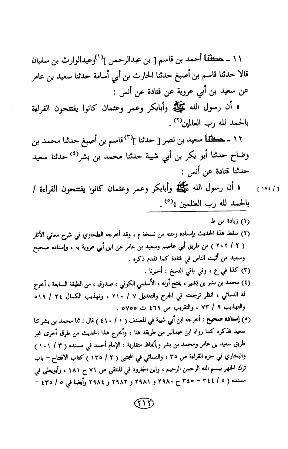 12 - حَدَّثَنَا سَعِيدُ بْنُ نَصْرٍ , حَدَّثَنَا قَاسِمُ بْنُ أَصْبَغَ , حَدَّثَنَا مُحَمَّدُ بْنُ وَضَّاحٍ , حَدَّثَنَا أَبُو بَكْرِ بْنُ أَبِي شَيْبَةَ , حَدَّثَنَا مُحَمَّدُ بْنُ بِشْرٍ , حَدَّثَنَا سَعِيدٌ , حَدَّثَنَا قَتَادَةُ , عَنْ أَنَسٍ: " أَنَّ رَسُولَ اللَّهِ صَلَّى اللهُ عَلَيْهِ وَسَلَّمَ , وَأَبَا بَكْرٍ , وَعُمَرَ , وَعُثْمَانَ كَانُوا §يَفْتَتِحُونَ الْقِرَاءَةَ بِـ {الْحَمْدُ لِلَّهِ رَبِّ الْعَالَمِينَ} [الفاتحة: 2]