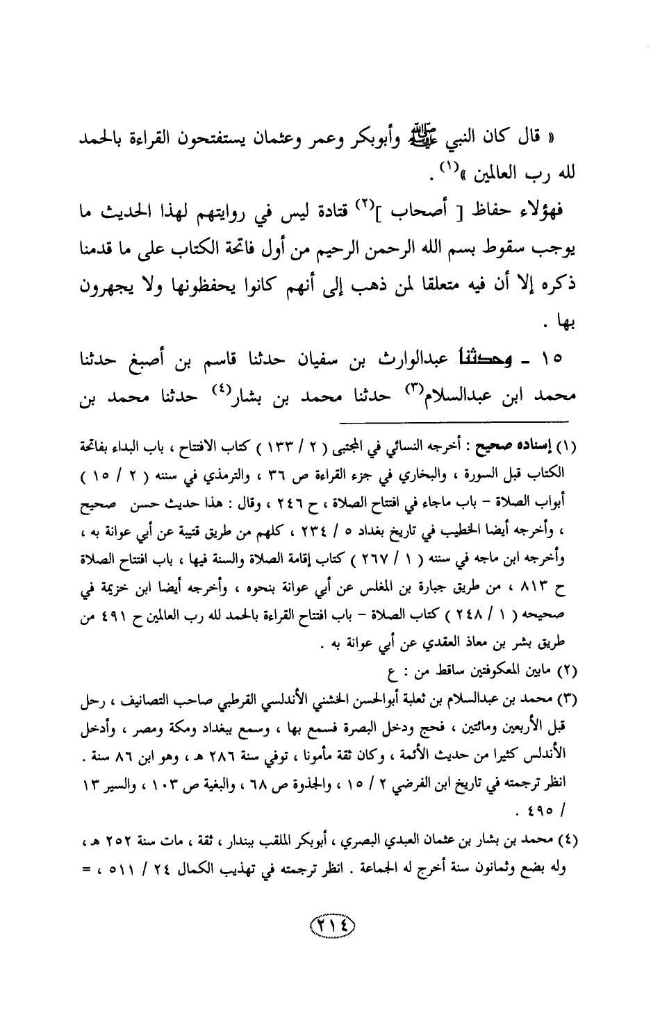 15 - وَحَدَّثَنَا عَبْدُ الْوَارِثِ بْنُ سُفْيَانَ , حَدَّثَنَا قَاسِمُ بْنُ أَصْبَغَ , حَدَّثَنَا مُحَمَّدُ بْنُ عَبْدِ السَّلَامِ , حَدَّثَنَا مُحَمَّدُ بْنُ بَشَّارٍ , حَدَّثَنَا مُحَمَّدُ بْنُ -[215]- جَعْفَرٍ غُنْدَرٌ , حَدَّثَنَا شُعْبَةُ , قَالَ: سَمِعْتُ قَتَادَةَ , عَنْ أَنَسٍ , رَضِيَ اللَّهُ عَنْهُ قَالَ: «صَلَّيْتُ مَعَ النَّبِيِّ صَلَّى اللهُ عَلَيْهِ وَسَلَّمَ , وَمَعَ أَبِي بَكْرٍ , وَعُمَرَ , وَعُثْمَانَ , §فَلَمْ أَسْمَعْ أَحَدًا مِنْهُمْ يَقْرَأُ بِسْمِ اللَّهِ الرَّحْمَنِ الرَّحِيمِ»