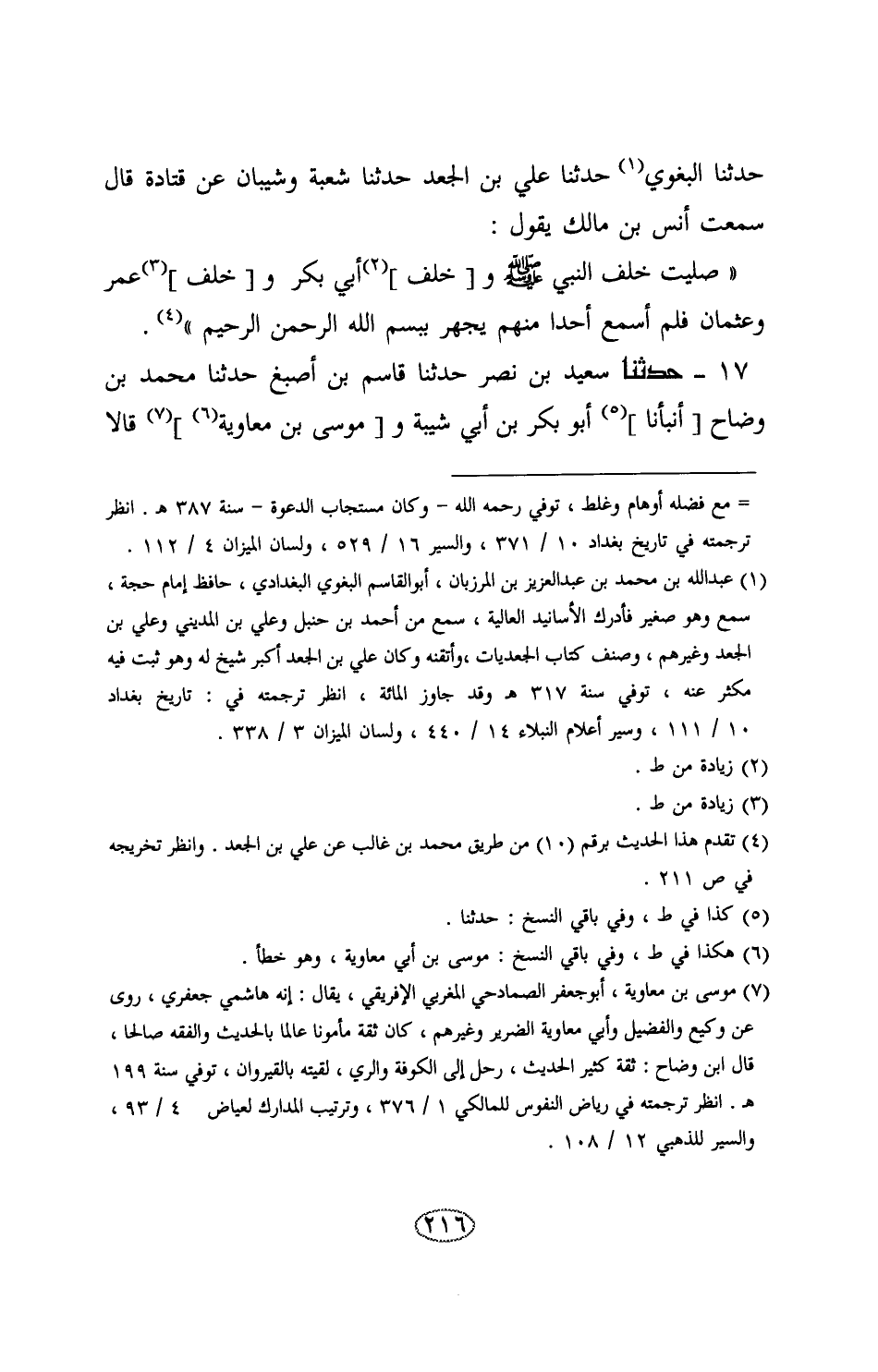 17 - حَدَّثَنَا سَعِيدُ بْنُ نَصْرٍ , حَدَّثَنَا قَاسِمُ بْنُ أَصْبَغَ , حَدَّثَنَا مُحَمَّدُ بْنُ وَضَّاحٍ , أَنْبَأَنَا أَبُو بَكْرِ بْنُ أَبِي شَيْبَةَ , وَمُوسَى بْنُ مُعَاوِيَةَ , قَالَا -[217]-: حَدَّثَنَا وَكِيعٌ , عَنْ شُعْبَةَ , عَنْ قَتَادَةَ , عَنْ أَنَسٍ , قَالَ: «صَلَّيْتُ خَلْفَ رَسُولِ اللَّهِ صَلَّى اللهُ عَلَيْهِ وَسَلَّمَ , وَأَبِي بَكْرٍ , وَعُمَرَ , وَعُثْمَانَ , فَكَانُوا §لَا يَجْهَرُونَ بِبِسْمِ اللَّهِ الرَّحْمَنِ الرَّحِيمِ»