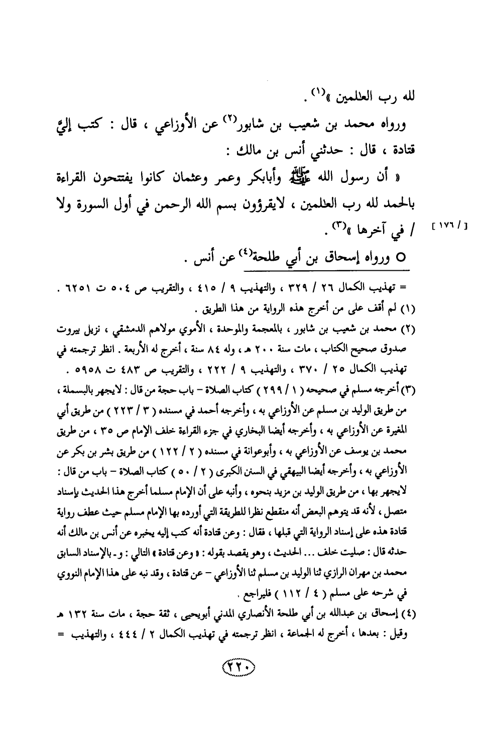 وَرَوَاهُ مُحَمَّدُ بْنُ شُعَيْبِ بْنِ شَابُورَ , عَنِ الْأَوْزَاعِيِّ قَالَ: كَتَبَ إِلَيَّ قَتَادَةُ قَالَ: حَدَّثَنِي أَنَسُ بْنُ مَالِكٍ: " أَنَّ رَسُولَ اللَّهِ صَلَّى اللهُ عَلَيْهِ وَسَلَّمَ , وَأَبَا بَكْرٍ , وَعُمَرَ , وَعُثْمَانَ , كَانُوا §يَفْتَتِحُونَ الْقِرَاءَةَ بِـ {الْحَمْدُ لِلَّهِ رَبِّ الْعَالَمِينَ} [الفاتحة: 2] , لَا يَقْرَءُونَ بِسْمِ اللَّهِ الرَّحْمَنِ الرَّحِيمِ فِي أَوَّلِ السُّورَةِ وَلَا فِي آخِرِهَا " وَرَوَاهُ إِسْحَاقُ بْنُ أَبِي طَلْحَةَ عَنْ أَنَسٍ