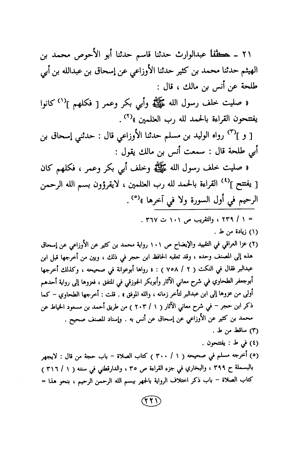 21 - حَدَّثَنَا عَبْدُ الْوَارِثِ , حَدَّثَنَا قَاسِمٌ , حَدَّثَنَا أَبُو الْأَحْوَصِ مُحَمَّدُ بْنُ الْهَيْثَمِ , حَدَّثَنَا مُحَمَّدُ بْنُ كَثِيرٍ , حَدَّثَنَا الْأَوْزَاعِيُّ , عَنْ إِسْحَاقَ بْنِ عَبْدِ اللَّهِ بْنِ أَبِي طَلْحَةَ , عَنْ أَنَسِ بْنِ مَالِكٍ , قَالَ: " صَلَّيْتُ خَلْفَ رَسُولِ اللَّهِ صَلَّى اللهُ عَلَيْهِ وَسَلَّمَ , وَأَبِي بَكْرٍ , وَعُمَرَ فَكُلُّهُمْ كَانُوا §يَفْتَتِحُونَ الْقِرَاءَةَ بِـ {الْحَمْدُ لِلَّهِ رَبِّ الْعَالَمِينَ} [الفاتحة: 2] "