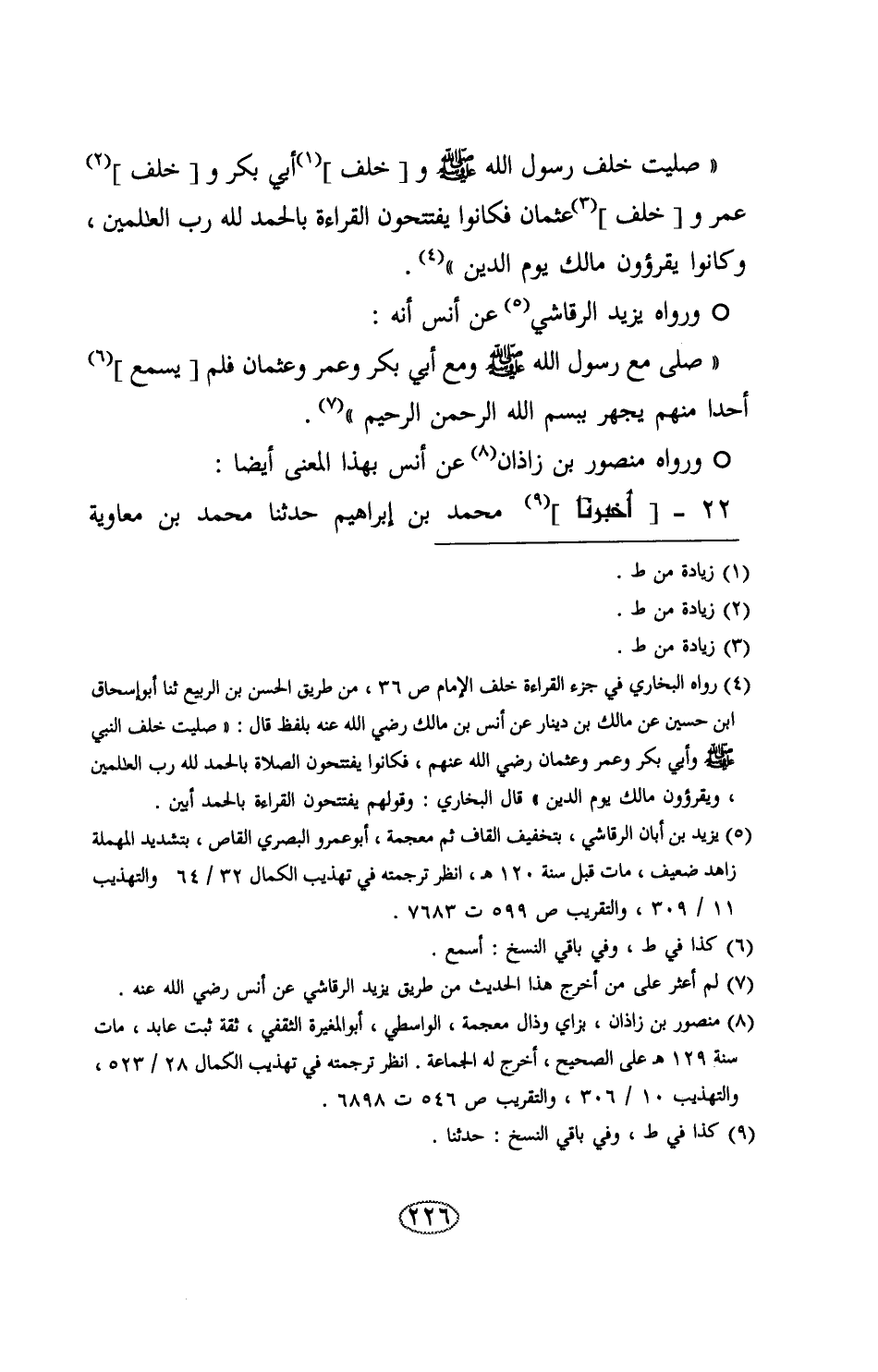22 - أَخْبَرَنَا مُحَمَّدُ بْنُ إِبْرَاهِيمَ , حَدَّثَنَا مُحَمَّدُ بْنُ مُعَاوِيَةَ , -[227]- وَحَدَّثَنَا عَبْدُ اللَّهِ بْنُ مُحَمَّدٍ , حَدَّثَنَا حَمْزَةُ , قَالَا: حَدَّثَنَا أَحْمَدُ بْنُ شُعَيْبٍ , أَنْبَأَنَا مُحَمَّدُ بْنُ عَلِيِّ بْنِ الْحَسَنِ بْنِ شَقِيقٍ , قَالَ: سَمِعْتُ أَبِي يَقُولُ: حَدَّثَنَا أَبُو حَمْزَةَ , عَنْ مَنْصُورِ بْنِ زَاذَانَ , عَنْ أَنَسِ بْنِ مَالِكٍ , قَالَ: §صَلَّى بِنَا رَسُولُ اللَّهِ صَلَّى اللهُ عَلَيْهِ وَسَلَّمَ فَلَمْ يُسْمِعْنَا قِرَاءَةَ بِسْمِ اللَّهِ الرَّحْمَنِ الرَّحِيمِ , وَصَلَّى بِنَا أَبُو بَكْرٍ , وَعُمَرُ , فَلَمْ نَسْمَعْهَا مِنْهُمَا وَرُوِيَ هَذَا الْحَدِيثُ عَنِ الْحَسَنِ , عَنْ أَنَسٍ , فَبَعْضُ رُوَاتِهِ يَقُولُ فِيهِ عَنْ أَنَسٍ: «صَلَّيْتُ مَعَ رَسُولِ اللَّهِ صَلَّى اللهُ عَلَيْهِ وَسَلَّمَ , وَمَعَ أَبِي بَكْرٍ , وَعُمَرَ , فَلَمْ أَسْمَعْهُمْ يَجْهَرُونَ -[228]- بِبِسْمِ اللَّهِ الرَّحْمَنِ الرَّحِيمِ» وَبَعْضُهُمْ يَقُولُ فِيهِ عَنْ أَنَسٍ: كَانَ النَّبِيُّ صَلَّى اللهُ عَلَيْهِ وَسَلَّمَ يُسِرُّ بِبِسْمِ اللَّهِ الرَّحْمَنِ الرَّحِيمِ , وَأَبُو بَكْرٍ , وَعُمَرُ ". وَرَوَاهُ عَائِذُ بْنُ شُرَيْحٍ , عَنْ أَنَسِ بْنِ مَالِكٍ قَالَ: صَلَّيْتُ خَلْفَ رَسُولِ اللَّهِ صَلَّى اللهُ عَلَيْهِ وَسَلَّمَ , وَأَبِي بَكْرٍ , وَعُمَرَ , وَعُثْمَانَ , فَلَمْ يَجْهَرُوا بِبِسْمِ اللَّهِ الرَّحْمَنِ الرَّحِيمِ , مِنْ حَدِيثِ أَبِي الْأَحْوَصِ سَلَامِ بْنِ سُلَيْمٍ , -[229]- عَنْ يُوسُفَ بْنِ أَسْبَاطٍ , عَنْ عَائِذِ بْنِ شُرَيْحٍ فَهَذَا مَا بَلَغَنَا مِنْ حَدِيثِ أَنَسِ بْنِ مَالِكٍ مِنِ اخْتِلَافِ أَلْفَاظِهِ , وَكُلُّهَا قَدْ نَزَعَ بِمَا شَاءَ مِنْهَا مَنِ احْتَجَّ لِمَذْهَبِهِ مِنَ الْفُقَهَاءِ الَّذِينَ ذَكَرْنَا مَذَاهِبَهُمْ فِي صَدْرِ هَذَا الْكِتَابِ , وَالتَّأْوِيلُ سَائِغٌ فِيهَا , وَلَا حُجَّةَ عِنْدِي فِي شَيْءٍ مِنْهَا؛ لِأَنَّهُ قَالَ مَرَّةً: كَانُوا يَفْتَتِحُونَ بِـ {الْحَمْدُ لِلَّهِ رَبِّ الْعَالَمِينَ} [الفاتحة: 2] وَمَرَّةً قَالَ: كَانُوا لَا يَجْهَرُونَ بِبِسْمِ اللَّهِ الرَّحْمَنِ الرَّحِيمِ وَمَرَّةً قَالَ: كَانُوا لَا يَقْرَءُونَهَا وَمَرَّةً قَالَ: لَمْ أَسْمَعْهُمْ يَقْرَءُونَ بِبِسْمِ اللَّهِ الرَّحْمَنِ الرَّحِيمِ -[230]- وَقَدْ قَالَ مَرَّةً إِذْ سُئِلَ عَنْ ذَلِكَ: كَبِرْتُ وَنَسِيتُ.