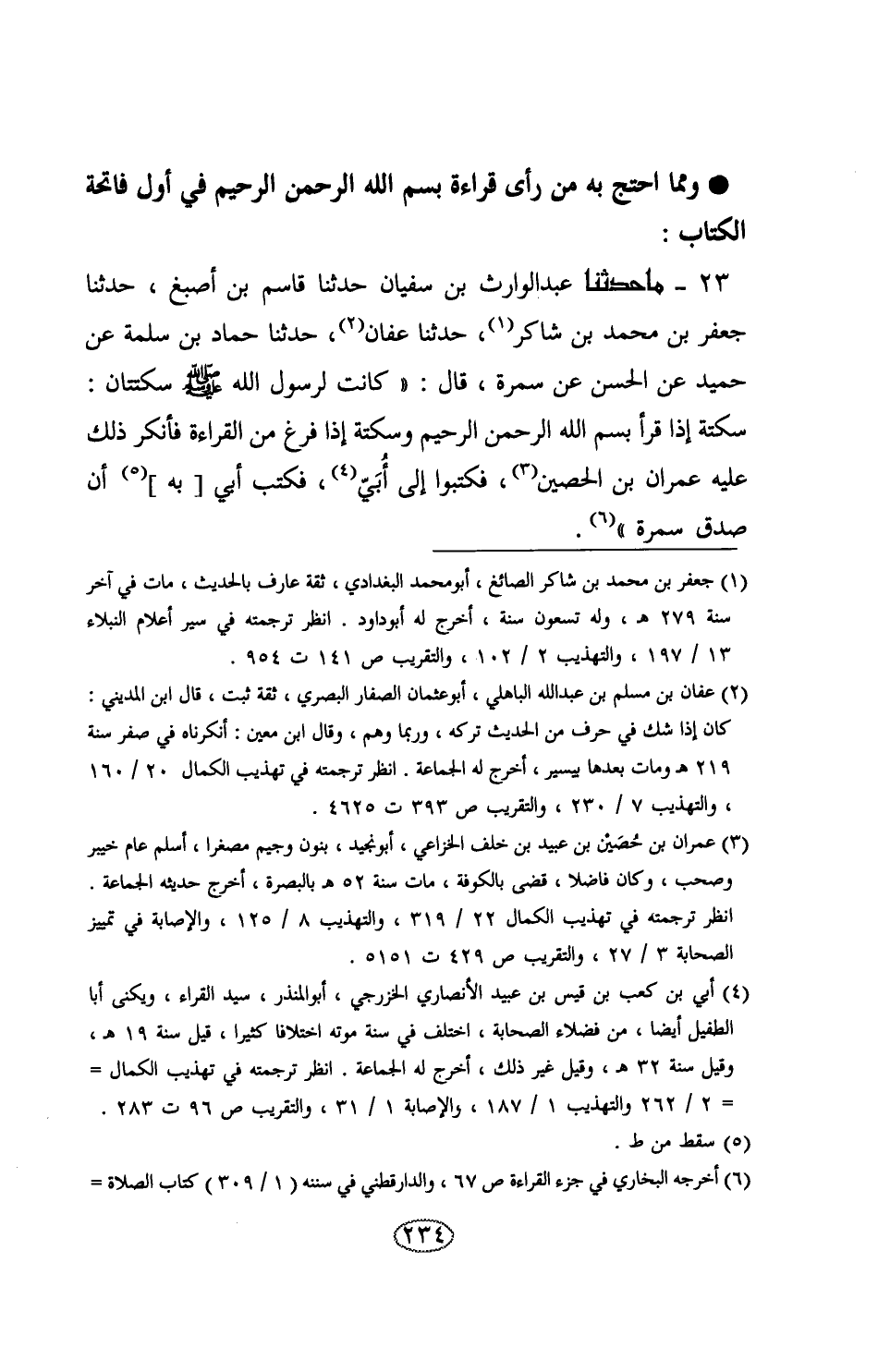 23 - مَا حَدَّثَنَا عَبْدُ الْوَارِثِ بْنُ سُفْيَانَ , حَدَّثَنَا قَاسِمُ بْنُ أَصْبَغَ , حَدَّثَنَا جَعْفَرُ بْنُ مُحَمَّدِ بْنِ شَاكِرٍ , حَدَّثَنَا عَفَّانُ , حَدَّثَنَا حَمَّادُ بْنُ سَلَمَةَ , عَنْ حُمَيْدٍ , عَنِ الْحَسَنِ , عَنْ سَمُرَةَ , قَالَ: كَانَتْ §لِرَسُولِ اللَّهِ صَلَّى اللهُ عَلَيْهِ وَسَلَّمَ سَكْتَتَانِ سَكْتَةٌ إِذَا قَرَأَ بِسْمِ اللَّهِ الرَّحْمَنِ الرَّحِيمِ , وَسَكْتَةٌ إِذَا فَرَغَ مِنَ الْقِرَاءَةِ " فَأَنْكَرَ ذَلِكَ عَلَيْهِ عِمْرَانُ بْنُ الْحُصَيْنِ , فَكَتَبُوا إِلَى أُبَيٍّ , فَكَتَبَ أُبَيٌّ بِهِ أَنْ صَدَقَ سَمُرَةُ
