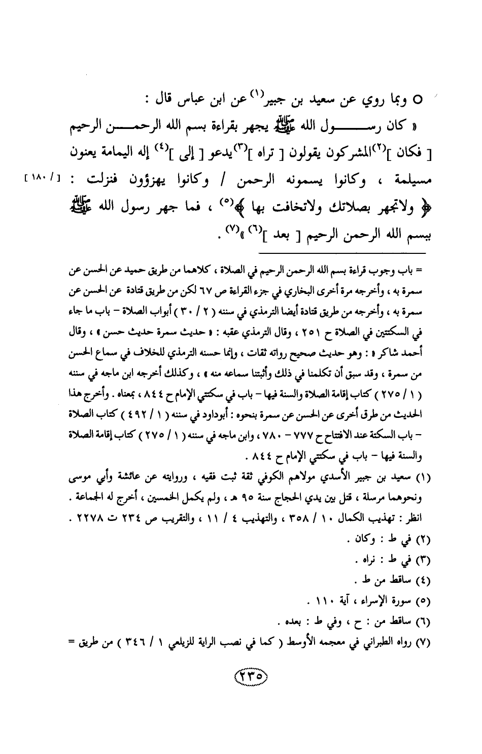 وَبِمَا رُوِيَ عَنْ سَعِيدِ بْنِ جُبَيْرٍ , عَنِ ابْنِ عَبَّاسٍ قَالَ: كَانَ رَسُولُ اللَّهِ صَلَّى اللهُ عَلَيْهِ وَسَلَّمَ §يَجْهَرُ بِقِرَاءَةِ بِسْمِ اللَّهِ الرَّحْمَنِ الرَّحِيمِ , فَكَانَ الْمُشْرِكُونَ يَقُولُونَ: تُرَاهُ يَدْعُو إِلَى إِلَهِ الْيَمَامَةِ يَعْنُونَ مُسَيْلِمَةَ , كَانُوا يُسَمُّونَهُ الرَّحْمَنَ , وَكَانُوا يَهْزَءُونَ , فَنَزَلَتْ: {وَلَا تَجْهَرْ بِصَلَاتِكَ وَلَا تُخَافِتْ} [الإسراء: 110] بِهَا , فَمَا جَهَرَ رَسُولُ اللَّهِ صَلَّى اللهُ عَلَيْهِ وَسَلَّمَ بِبِسْمِ اللَّهِ الرَّحْمَنِ الرَّحِيمِ بَعْدُ -[236]- قَالَ أَبُو عُمَرَ: هَذِهِ الرِّوَايَةُ ضَعِيفَةٌ فِي تَأْوِيلِ هَذِهِ الْآيَةِ , لَمْ يُتَابَعْ عَلَيْهَا الَّذِي جَاءَ بِهَا , وَفِي هَذِهِ الْآيَةِ أَقَاوِيلُ قَدْ ذَكَرْتُهَا فِي كِتَابِ الِاسْتِذْكَارِ , وَالْحَمْدُ لِلَّهِ وَأَمَّا مَا رُوِيَ عَنِ الصَّحَابَةِ وَالتَّابِعِينَ فِي قِرَاءَةِ بِسْمِ اللَّهِ الرَّحْمَنِ الرَّحِيمِ سِرًّا فِي أَوَّلِ فَاتِحَةِ الْكِتَابِ فِي الصَّلَاةِ؛ فَمِنْ ذَلِكَ مَا ذَكَرَهُ وَكِيعٌ -[237]-: فِيمَا حَدَّثَنَاهُ عَبْدُ الْوَارِثِ بْنُ سُفْيَانَ , حَدَّثَنَا قَاسِمُ بْنُ أَصْبَغَ , حَدَّثَنَا ابْنُ وَضَّاحٍ , حَدَّثَنَا مُوسَى بْنُ مُعَاوِيَةَ , حَدَّثَنَا وَكِيعٌ وَمَا ذَكَرَهُ عَبْدُ الرَّزَّاقِ فِيمَا حَدَّثَنَاهُ خَلَفُ بْنُ سَعِيدٍ , حَدَّثَنَا عَبْدُ اللَّهِ بْنُ مُحَمَّدِ بْنِ عَلِيٍّ , حَدَّثَنَا أَحْمَدُ بْنُ خَالِدٍ , حَدَّثَنَا إِسْحَاقُ بْنُ إِبْرَاهِيمَ , حَدَّثَنَا عَبْدُ الرَّزَّاقِ وَمَا ذَكَرَهُ أَبُو بَكْرِ بْنُ أَبِي شَيْبَةَ , فِيمَا حَدَّثَنَاهُ أَحْمَدُ بْنُ عَبْدِ اللَّهِ بْنِ مُحَمَّدِ بْنِ عَلِيٍّ , عَنْ أَبِيهِ , عَنْ عَبْدِ اللَّهِ بْنِ -[238]- يُونُسَ , عَنْ بَقِيِّ بْنِ مَخْلَدٍ , عَنْ أَبِي بَكْرٍ وَمِنْ غَيْرِ كُتُبِ هَؤُلَاءِ أَيْضًا نَذْكُرُ مِنْهَا مَا حَضَرَنَا ذِكْرُهُ مِنْهَا مَا رُوِيَ عَنْ عُمَرَ بْنِ الْخَطَّابِ مِنْ وُجُوهٍ لَيْسَتْ بِالْقَائِمَةِ أَنَّهُ قَالَ: " لَا يُخْفِي الْإِمَامُ أَرْبَعًا: التَّعَوُّذَ , وَبِسْمِ اللَّهِ الرَّحْمَنِ الرَّحِيمِ , وَآمِينَ , وَرَبَّنَا وَلَكَ الْحَمْدُ "