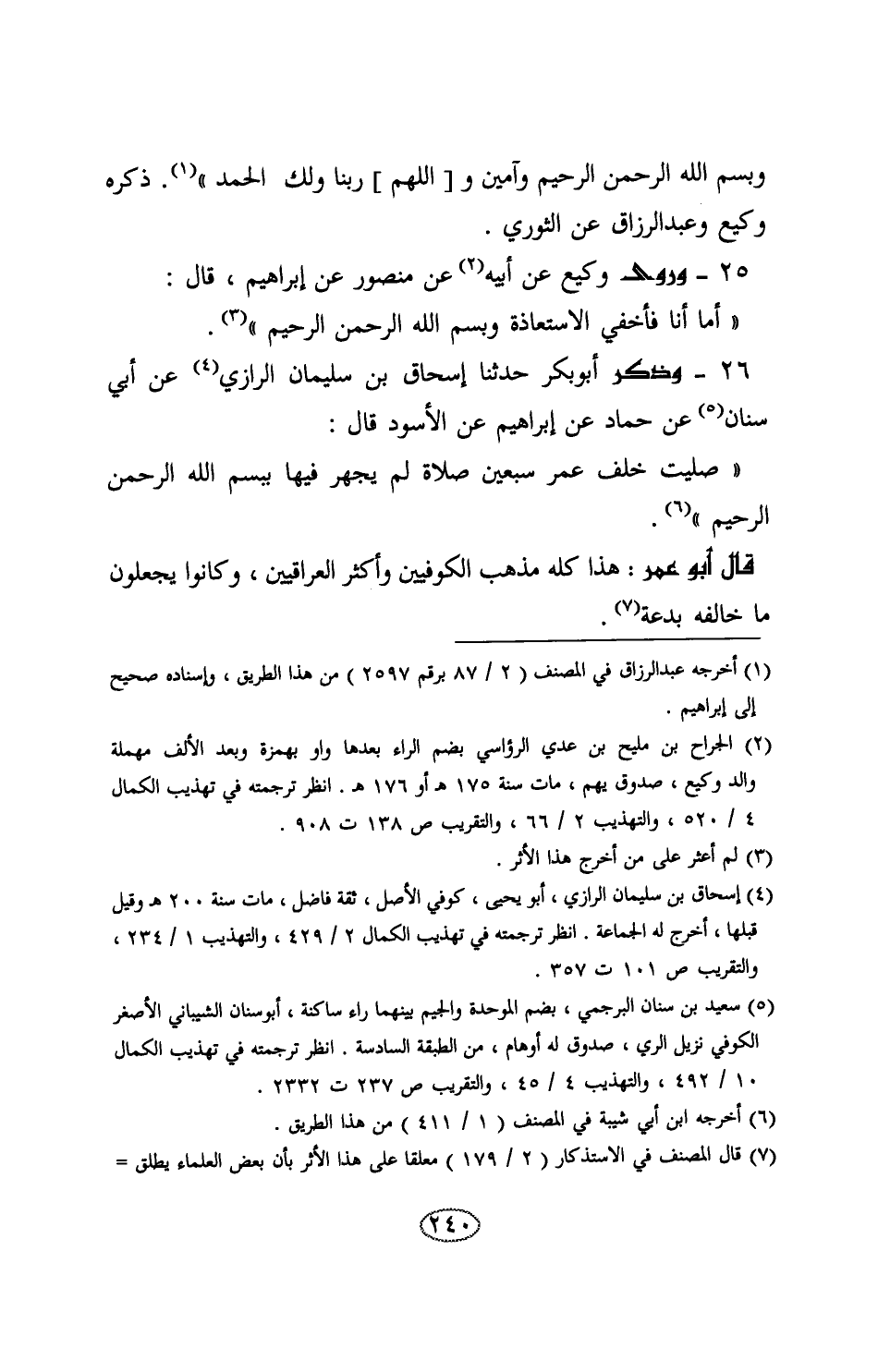 26 - وَذَكَرَ أَبُو بَكْرٍ , حَدَّثَنَا إِسْحَاقُ بْنُ سُلَيْمَانَ الرَّازِيُّ , عَنْ أَبِي سِنَانٍ , عَنْ حَمَّادٍ , عَنْ إِبْرَاهِيمَ , عَنِ الْأَسْوَدِ , قَالَ: صَلَّيْتُ خَلْفَ عُمَرَ سَبْعِينَ صَلَاةً §لَمْ يَجْهَرْ فِيهَا بِبِسْمِ اللَّهِ الرَّحْمَنِ الرَّحِيمِ قَالَ أَبُو عُمَرَ: هَذَا كُلُّهُ مَذْهَبُ الْكُوفِيِّينَ وَأَكْثَرِ الْعِرَاقِيِّينَ , وَكَانُوا يَجْعَلُونَ مَا خَالَفَهُ بِدْعَةً