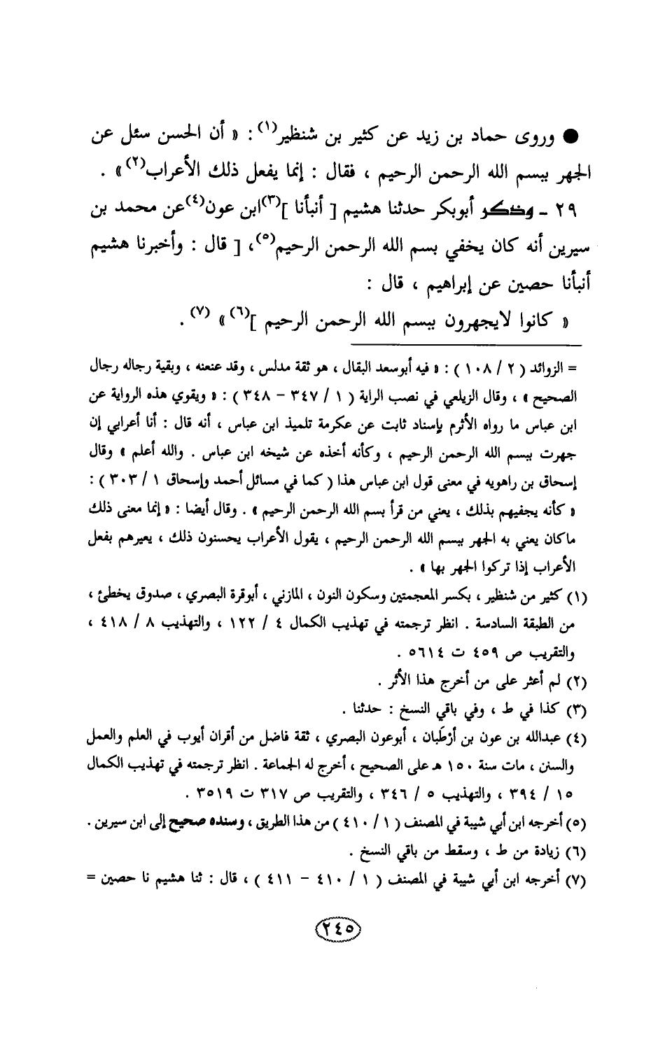 وَرَوَى حَمَّادُ بْنُ زَيْدٍ , عَنْ كَثِيرِ بْنِ شِنْظِيرٍ أَنَّ الْحَسَنَ سُئِلَ عَنِ §الْجَهْرِ بِـ بِسْمِ اللَّهِ الرَّحْمَنِ الرَّحِيمِ , فَقَالَ: «إِنَّمَا يَفْعَلُ ذَلِكَ الْأَعْرَابُ»