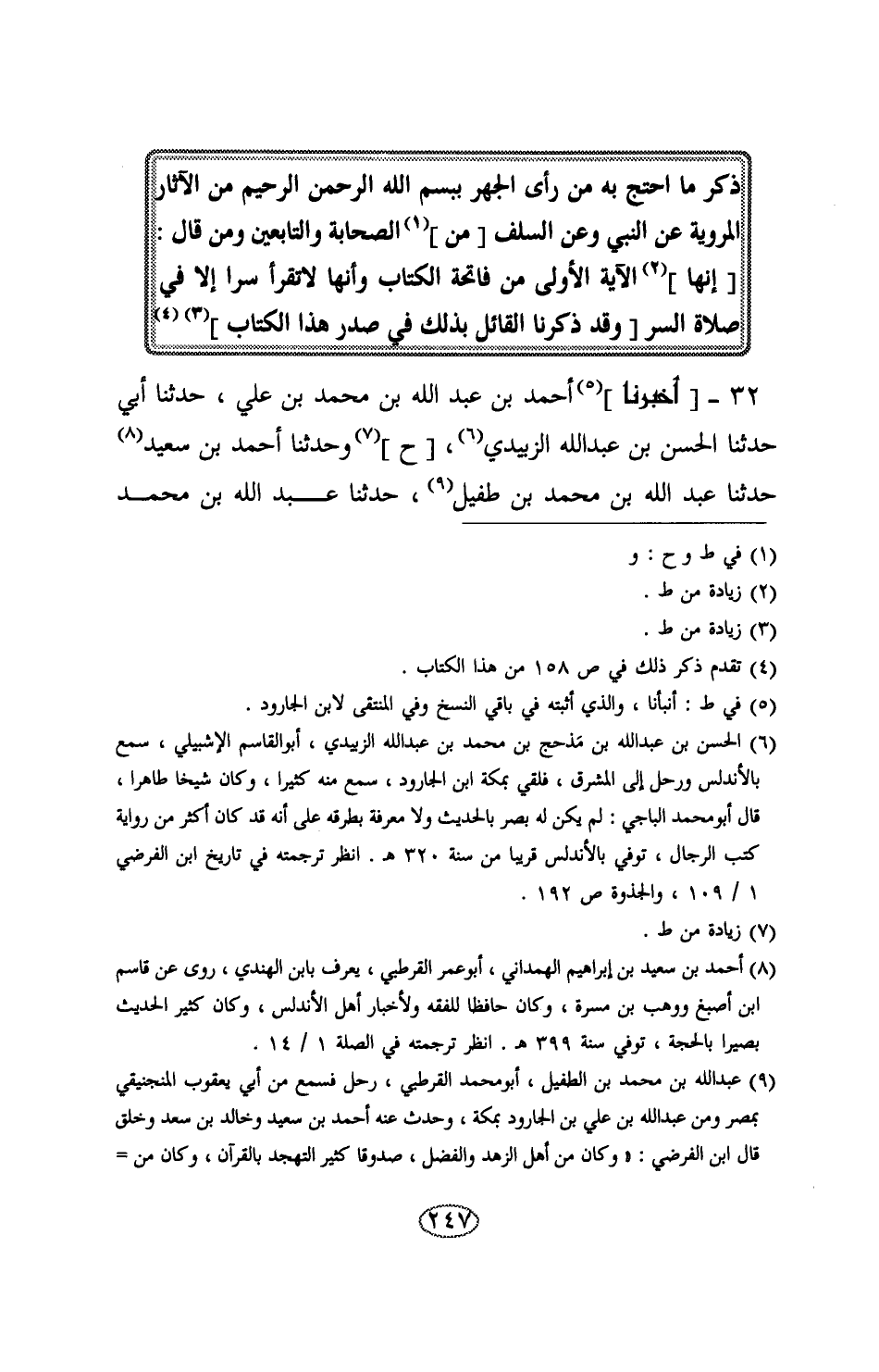§ذِكْرُ مَا احْتَجَّ بِهِ مَنْ رَأَى الْجَهْرَ بِبِسْمِ اللَّهِ الرَّحْمَنِ الرَّحِيمِ مِنَ الْآثَارِ الْمَرْوِيَّةِ عَنِ النَّبِيِّ , وَعَنِ السَّلَفِ مِنَ الصَّحَابَةِ , وَالتَّابِعِينَ , وَمَنْ قَالَ إِنَّهَا الْآيَةُ الْأُولَى مِنْ فَاتِحَةِ الْكِتَابِ , وَأَنَّهَا لَا تُقْرَأُ سِرًّا إِلَّا فِي صَلَاةِ السِّرِّ , وَقَدْ ذَكَرْنَا الْقَائِلَ بِذَلِكَ فِي صَدْرِ هَذَا الْكِتَابِ