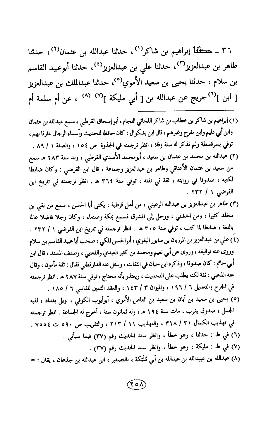 36 - حَدَّثَنَا إِبْرَاهِيمُ بْنُ شَاكِرٍ , حَدَّثَنَا عَبْدُ اللَّهِ بْنُ عُثْمَانَ , حَدَّثَنَا طَاهِرُ بْنُ عَبْدِ الْعَزِيزِ , حَدَّثَنَا عَلِيُّ بْنُ عَبْدِ الْعَزِيزِ , حَدَّثَنَا أَبُو عُبَيْدٍ الْقَاسِمُ بْنُ سَلَّامَ , حَدَّثَنَا يَحْيَى بْنُ سَعِيدٍ الْأُمَوِيُّ , حَدَّثَنَا عَبْدُ الْمَلِكِ بْنُ عَبْدِ الْعَزِيزِ بْنِ جُرَيْجٍ , عَنْ عَبْدِ اللَّهِ بْنِ أَبِي مُلَيْكَةَ , عَنْ أُمِّ سَلَمَةَ أُمِّ -[259]- الْمُؤْمِنِينَ , رَضِيَ اللَّهُ عَنْهَا , قَالَتْ: كَانَ رَسُولُ اللَّهِ صَلَّى اللهُ عَلَيْهِ وَسَلَّمَ §يُقَطِّعُ قِرَاءَتَهُ آيَةً , آيَةً , {بِسْمِ اللَّهِ الرَّحْمَنِ الرَّحِيمِ الْحَمْدُ لِلَّهِ رَبِّ الْعَالَمِينَ} [الفاتحة: 2]