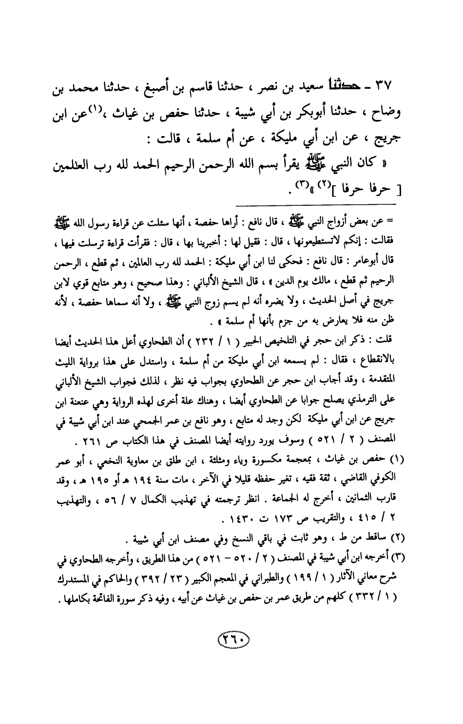 37 - حَدَّثَنَا سَعِيدُ بْنُ نَصْرٍ , حَدَّثَنَا قَاسِمُ بْنُ أَصْبَغَ , حَدَّثَنَا مُحَمَّدُ بْنُ وَضَّاحٍ , حَدَّثَنَا أَبُو بَكْرِ بْنُ أَبِي شَيْبَةَ , حَدَّثَنَا حَفْصُ بْنُ غِيَاثٍ , عَنِ ابْنِ جُرَيْجٍ , عَنِ ابْنِ أَبِي مُلَيْكَةَ , عَنْ أُمِّ سَلَمَةَ , قَالَتْ: كَانَ النَّبِيُّ صَلَّى اللهُ عَلَيْهِ وَسَلَّمَ §يَقْرَأُ {بِسْمِ اللَّهِ الرَّحْمَنِ الرَّحِيمِ , الْحَمْدُ لِلَّهِ رَبِّ الْعَالَمِينَ} [الفاتحة: 2] حَرْفًا حَرْفًا