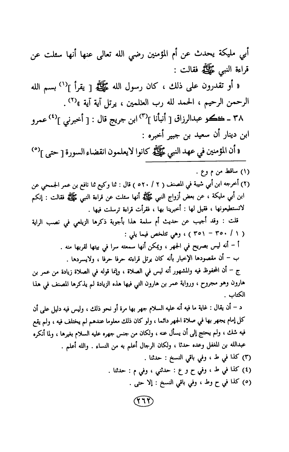 38 - ذَكَرَ عَبْدُ الرَّزَّاقِ , أَنْبَأَنَا ابْنُ جُرَيْجٍ , قَالَ: أَخْبَرَنِي عَمْرُو بْنُ دِينَارٍ , أَنَّ سَعِيدَ بْنَ جُبَيْرٍ , أَخْبَرَهُ أَنَّ الْمُؤْمِنِينَ فِي عَهْدِ النَّبِيِّ صَلَّى اللهُ عَلَيْهِ وَسَلَّمَ كَانُوا §لَا يَعْلَمُونَ انْقِضَاءَ السُّورَةِ حَتَّى -[263]- تَنْزِلَ بِسْمِ اللَّهِ الرَّحْمَنِ الرَّحِيمِ , فَإِذَا نَزَلَتْ بِسْمِ اللَّهِ الرَّحْمَنِ الرَّحِيمِ عَلِمُوا أَنَّ السُّورَةَ قَدِ انْقَضَتْ وَنَزَلَتِ الْأُخْرَى وَرَوَى هَذَا الْحَدِيثَ جَمَاعَةٌ عَنِ ابْنِ جُرَيْجِ عَنْ عَمْرِو بْنِ دِينَارٍ عَنْ سَعِيدِ بْنِ جُبَيْرٍ عَنِ ابْنِ عَبَّاسٍ