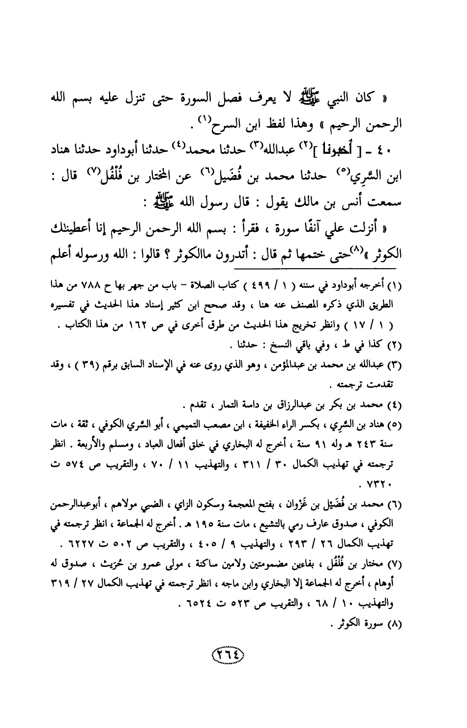 40 - أَخْبَرَنَا عَبْدُ اللَّهِ , حَدَّثَنَا مُحَمَّدٌ , حَدَّثَنَا أَبُو دَاوُدَ , حَدَّثَنَا هَنَّادُ بْنُ السَّرِيِّ , حَدَّثَنَا مُحَمَّدُ بْنُ فُضَيْلٍ , عَنِ الْمُخْتَارِ بْنِ فُلْفُلٍ , قَالَ: سَمِعْتُ أَنَسَ بْنَ مَالِكٍ , يَقُولُ: قَالَ رَسُولُ اللَّهِ صَلَّى اللهُ عَلَيْهِ وَسَلَّمَ: «أُنْزِلَتْ عَلَيَّ آنِفًا سُورَةٌ» فَقَرَأَ: بِسْمِ اللَّهِ الرَّحْمَنِ الرَّحِيمِ , إِنَّا أَعْطَيْنَاكَ الْكَوْثَرَ حَتَّى خَتَمَهَا ثُمَّ قَالَ: «§أَتَدْرُونَ مَا الْكَوْثَرُ؟» قَالُوا: اللَّهُ وَرَسُولُهُ أَعْلَمُ -[265]- قَالَ: «فَإِنَّهُ نَهَرٌ وَعَدَنِيهِ رَبِّي فِي الْجَنَّةِ»