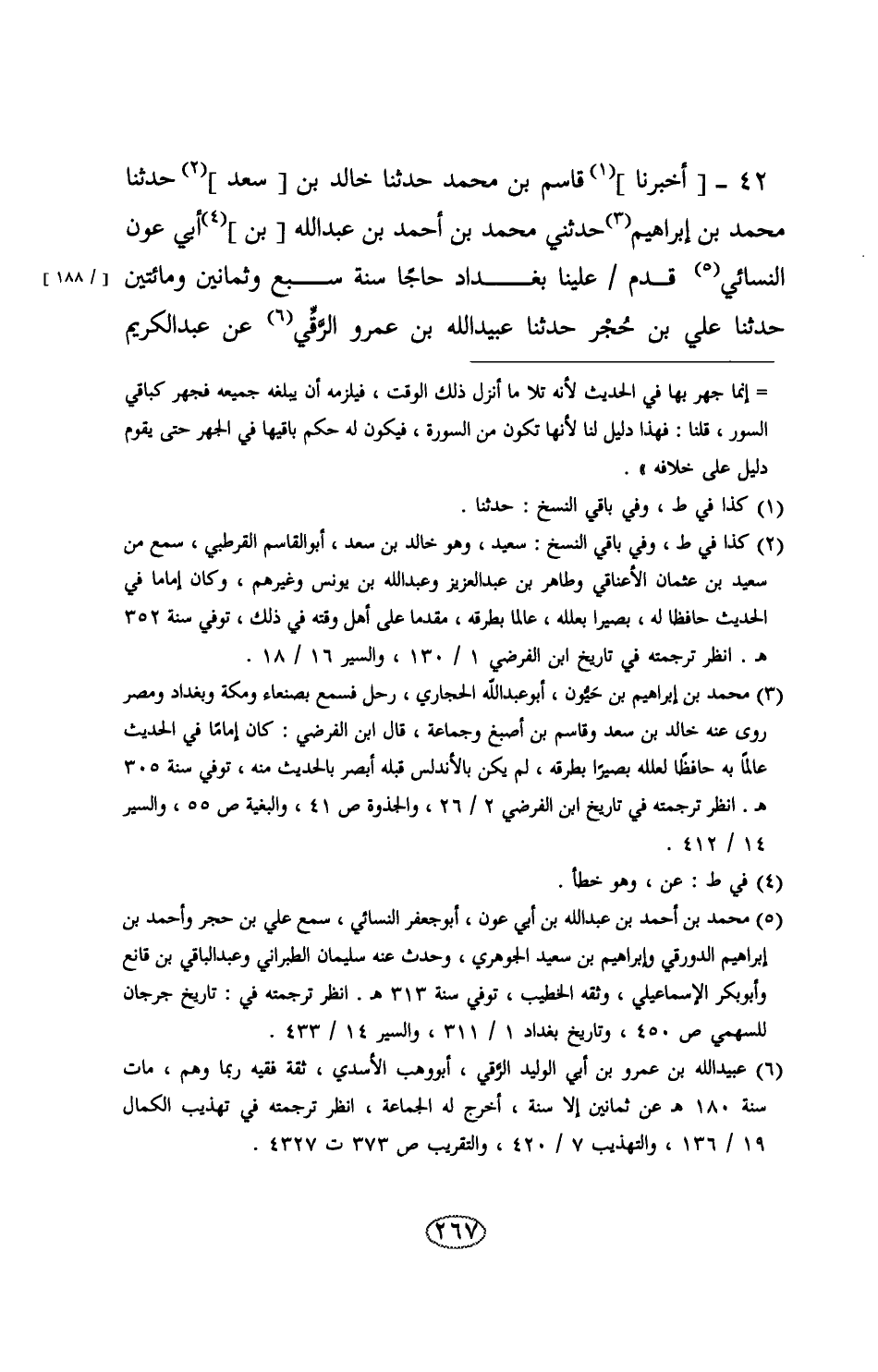 42 - أَخْبَرَنَا قَاسِمُ بْنُ مُحَمَّدٍ , حَدَّثَنَا خَالِدُ بْنُ سَعْدٍ , حَدَّثَنَا مُحَمَّدُ بْنُ إِبْرَاهِيمَ , حَدَّثَنِي مُحَمَّدُ بْنُ أَحْمَدَ بْنِ عَبْدِ اللَّهِ بْنِ أَبِي عَوْنٍ النَّسَائِيُّ , قَدِمَ عَلَيْنَا بَغْدَادَ حَاجًّا سَنَةَ سَبْعٍ وَثَمَانِينَ وَمِائَتَيْنِ , حَدَّثَنَا عَلِيُّ بْنُ حُجْرٍ , حَدَّثَنَا عُبَيْدُ اللَّهِ بْنُ عَمْرٍو الرَّقِّيُّ , عَنْ عَبْدِ الْكَرِيمِ -[268]- الْجَزَرِيِّ , عَنْ أَبِي الزُّبَيْرِ , عَنْ عَبْدِ اللَّهِ بْنِ عُمَرَ , عَنِ النَّبِيِّ صَلَّى اللهُ عَلَيْهِ وَسَلَّمَ " أَنَّهُ كَانَ §إِذَا قَامَ فِي الصَّلَاةِ فَأَرَادَ أَنْ يَقْرَأَ قَالَ: بِسْمِ اللَّهِ الرَّحْمَنِ الرَّحِيمِ " قَالَ أَبُو عُمَرَ: قَدْ رَفَعَهُ غَيْرُهُ أَيْضًا عَنِ ابْنِ عُمَرَ , وَلَا يَثْبُتُ فِيهِ إِلَّا أَنَّهُ مَوْقُوفٌ عَلَى ابْنِ عُمَرَ مِنْ فِعْلِهِ , وَاللَّهُ أَعْلَمُ كَذَلِكَ رَوَاهُ سَالِمٌ وَنَافِعٌ وَيَزِيدُ الْفَقِيرُ عَنِ ابْنِ عُمَرَ