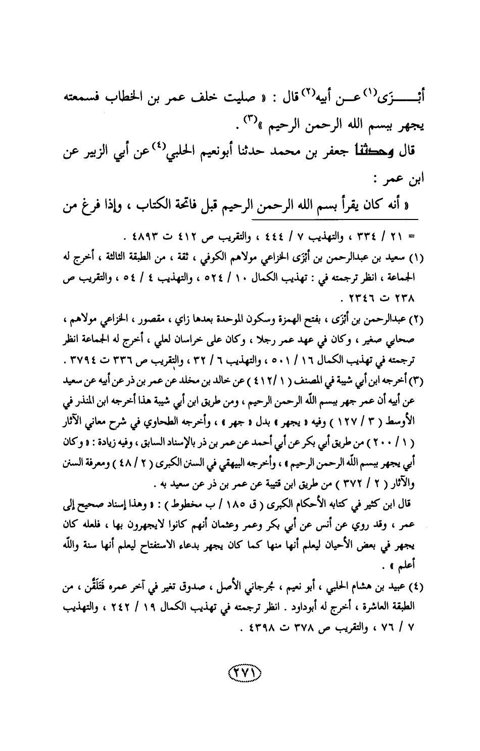 قَالَ: وَحَدَّثَنَا جَعْفَرُ بْنُ مُحَمَّدٍ , حَدَّثَنَا أَبُو نُعَيْمٍ الْحَلَبِيُّ , عَنْ أَبِي الزُّبَيْرِ , عَنِ ابْنِ عُمَرَ: أَنَّهُ كَانَ §يَقْرَأُ {بِسْمِ اللَّهِ الرَّحْمَنِ الرَّحِيمِ} [الفاتحة: 1] قَبْلَ فَاتِحَةِ الْكِتَابِ , وَإِذَا فَرَغَ مِنَ -[272]- السُّورَةِ , وَيَجْهَرُ فِيهَا