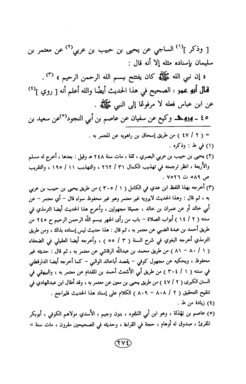 45 - وَرَوَى وَكِيعٌ عَنْ سُفْيَانَ , عَنْ عَاصِمِ بْنِ أَبِي النَّجُودِ , عَنْ سَعِيدِ بْنِ -[275]- جُبَيْرٍ , عَنِ ابْنِ عَبَّاسٍ , رَضِيَ اللَّهُ عَنْهُمَا أَنَّهُ كَانَ §يَجْهَرُ بِبِسْمِ اللَّهِ الرَّحْمَنِ الرَّحِيمِ
