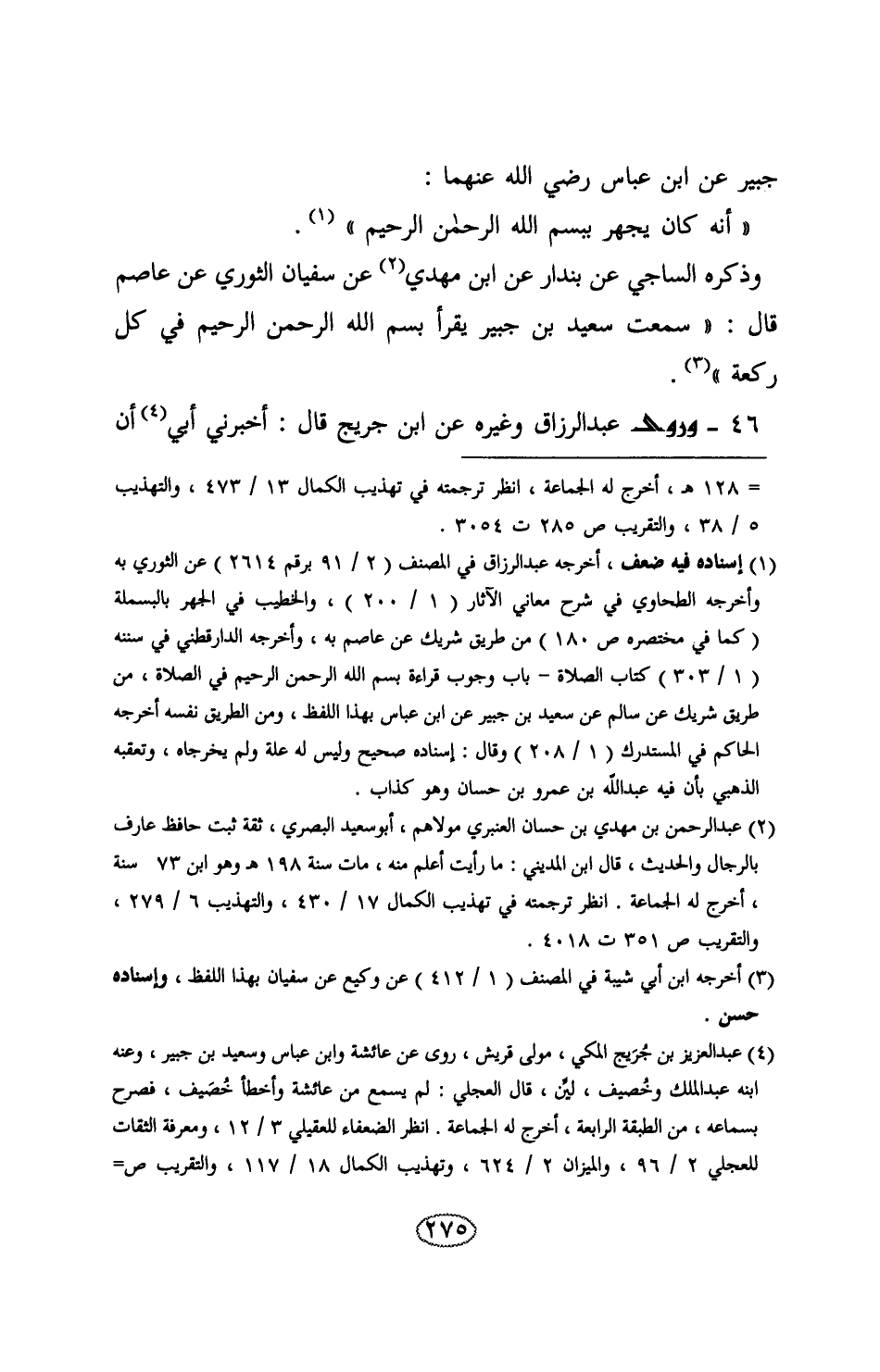 46 - وَرَوَى عَبْدُ الرَّزَّاقِ وَغَيْرُهُ , عَنِ ابْنِ جُرَيْجٍ , قَالَ: أَخْبَرَنِي أَبِي , أَنَّ -[276]- سَعِيدَ بْنَ جُبَيْرٍ أَخْبَرَهُ , عَنِ ابْنِ عَبَّاسٍ , رَضِيَ اللَّهُ عَنْهُمَا: قَالَ فِي قَوْلِ اللهِ تَعَالَى: {§وَلَقَدْ آتَيْنَاكَ سَبْعًا مِنَ الْمَثَانِي} [الحجر: 87] قَالَ: «هِيَ أُمُّ الْقُرْآنِ» قَالَ عَبْدُ الرَّزَّاقِ: قَرَأَهَا عَلَيَّ ابْنُ جُرَيْجٍ: {بِسْمِ اللَّهِ الرَّحْمَنِ الرَّحِيمِ الْحَمْدُ للَّهِ رَبِّ الْعَالَمِينَ الرَّحْمَنِ الرَّحِيمِ مَالِكِ يَوْمِ الدِّينِ إِيَّاكَ نَعْبُدُ وَإِيَّاكَ نَسْتَعِينُ اهْدِنَا الصِّرَاطَ الْمُسْتَقِيمَ صِرَاطَ الَّذِينَ أَنْعَمْتَ عَلَيْهِمْ غَيْرِ الْمَغْضُوبِ عَلَيْهِمْ وَلَا الضَّالِّينَ} آيَةً آيَةً , وَقَالَ: قَرَأَهُ عَلَيَّ أَبِي كَمَا قَرَأْتُهَا عَلَيْكَ , وَقَالَ: قَرَأَهَا عَلَيَّ سَعِيدُ بْنُ جُبَيْرٍ كَمَا قَرَأْتُهَا عَلَيْكَ , وَقَالَ: قَرَأَهَا عَلَيَّ ابْنُ عَبَّاسٍ كَمَا قَرَأْتُهَا عَلَيْكَ , وَقَالَ ابْنُ عَبَّاسٍ: «قَدْ أَخْرَجَهَا اللَّهُ لَكُمْ وَمَا أَخْرَجَهَا لِأَحَدٍ قَبْلَكُمْ» يَعْنِي: فَاتِحَةَ الْكِتَابِ السَّبْعَ الْمَثَانِيَ