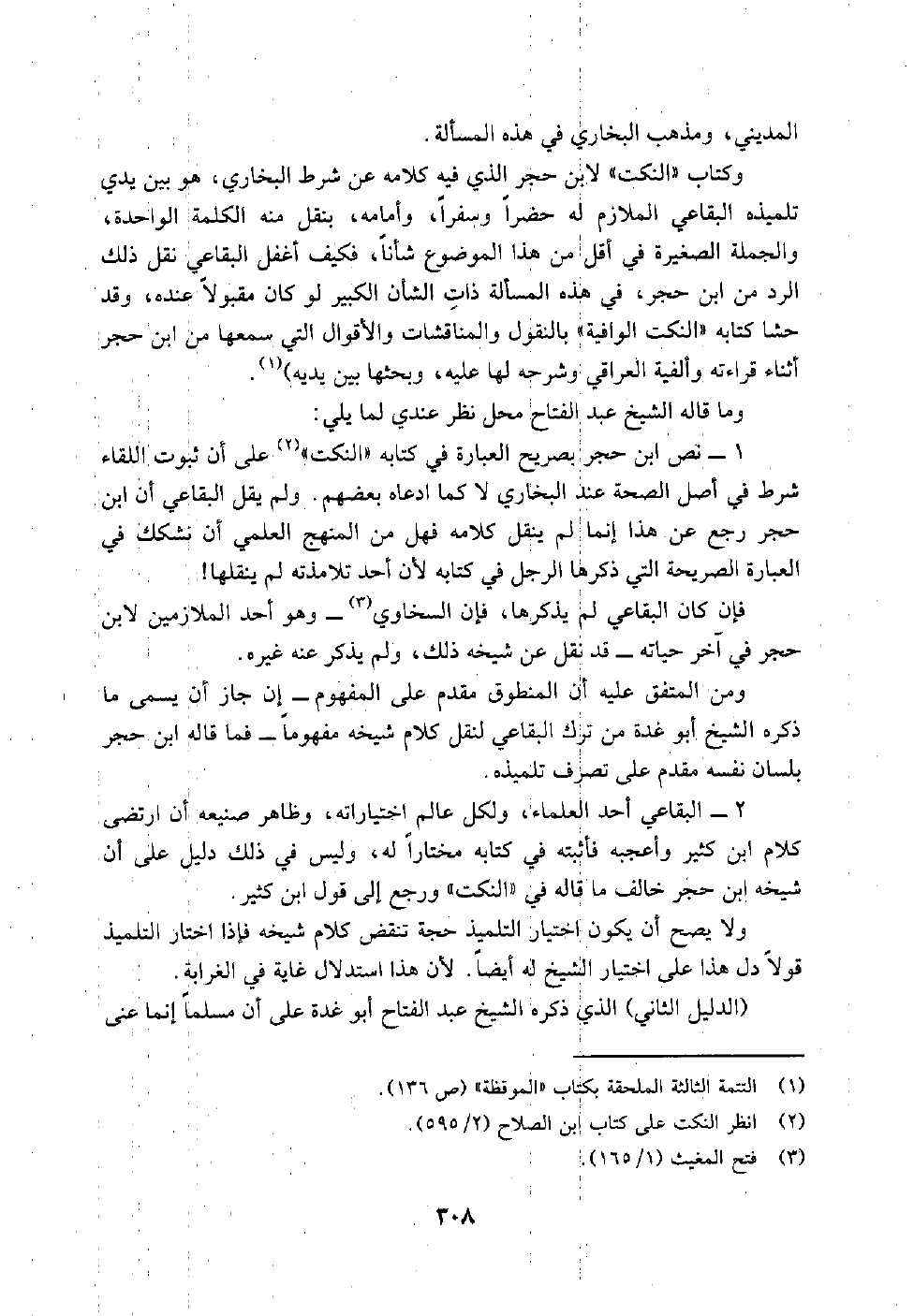 1- ... المقدمة التي بنى عليها حكمه في أن "احتمال عدم السماع أقرب فيما يرويه السامع ويكثر في روايته مع حقارة زمن اللقاء" لا يسلم له بها، وهي أن البخاري أخذ وحكم باتصال أحاديث معنعنة كثيرة يرويها راو لم يثبت له إلا اللقي