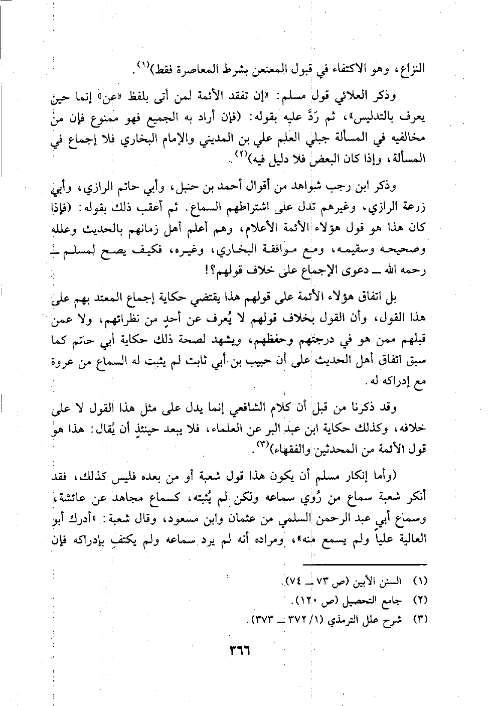 ويدل صنيع مسلم على أنه إذا وجدت واسطة في السند بين المنعنعن والمعنعن عنه كان ذلك قرينة قوية على عدم السماع. فلابد لقبول الخبر من ثبوت السماع أو اللقاء بينهما.