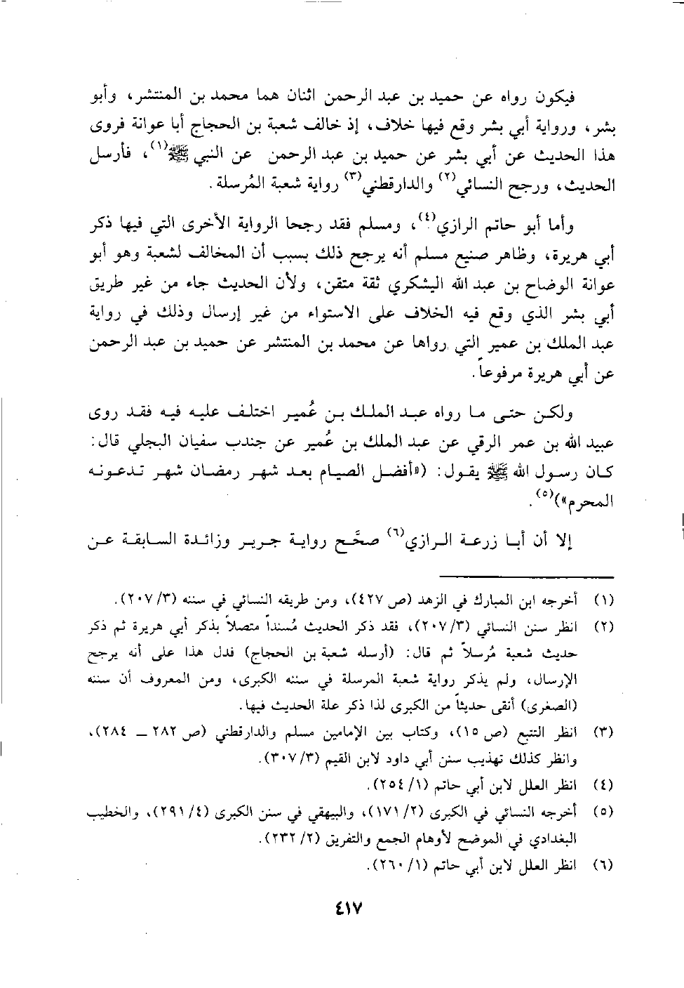 وقد قال الشيخ المعلمي معللاً عدم إخراج مسلم لحديث أبي رافع في "صحيحه": (لم يخرجه مسلم - رحمه الله - في الصحيح، وذلك يدل على توقف له فيه لأنه ليس هناك طريق أخرى صحيحة يوردها ويجعل هذه متابعة لها، والحديث في حكم وسنة، وقد أنصف بذلك) (¬4) .