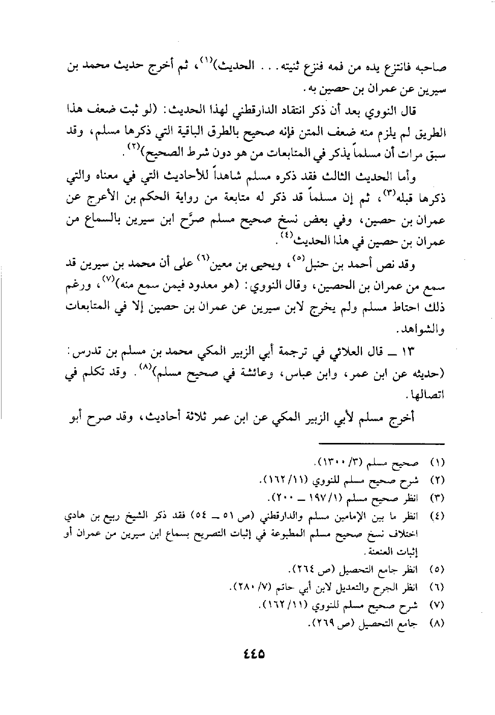 وما دام هذا الإلزام لم يحدد عدد الأحاديث الموجودة في صحيح مسلم بتلك الصفة، ولم يحدد هل هي في الأصول أم في المتابعات؟، ولم يذكر هل بحث عن السماع فيها أم لا؟، ولم يذكر هل لتلك الأحاديث متابعات وشواهد أم لا؟، ولم يوضح هل هي في أحاديث الأحكام أم في أحاديث الفضائل ونحوها؟ والدليل إذا تطرق إليه الاحتمال سقط به الاستدلال.