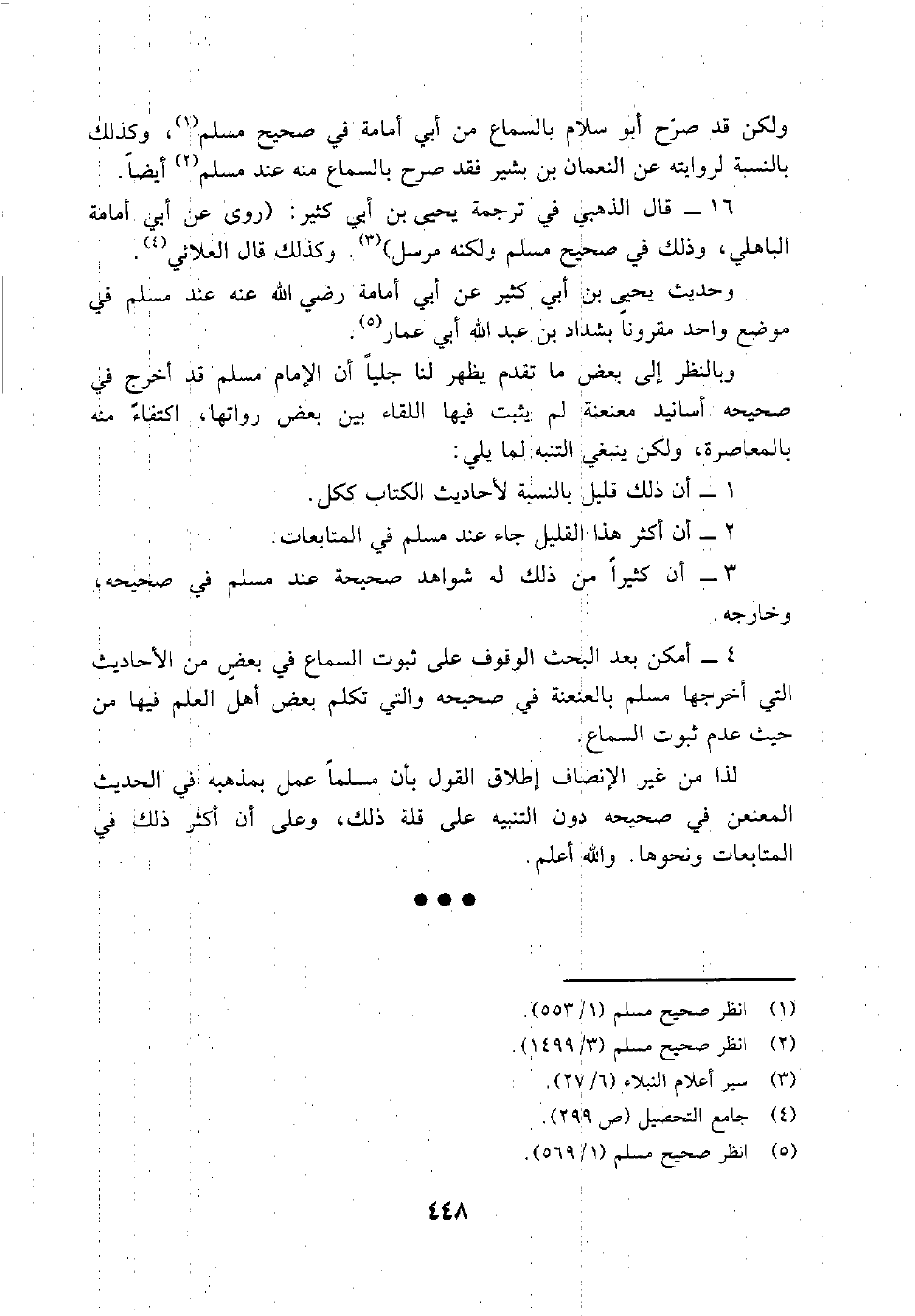 وفي ختام هذا الفصل يظهر لنا أن جميع الأدلة التي احتج بها مسلم وغيره من العلماء على أن المعاصرة كافية لاتصال السند المعنعن، لا تسلم من نقاط ضعف فيها، تؤثر في اعتمادها والأخذ بها، وقد بينت في المبحث الثاني أوجه المعارضة وعدم القبول لكل دليل.