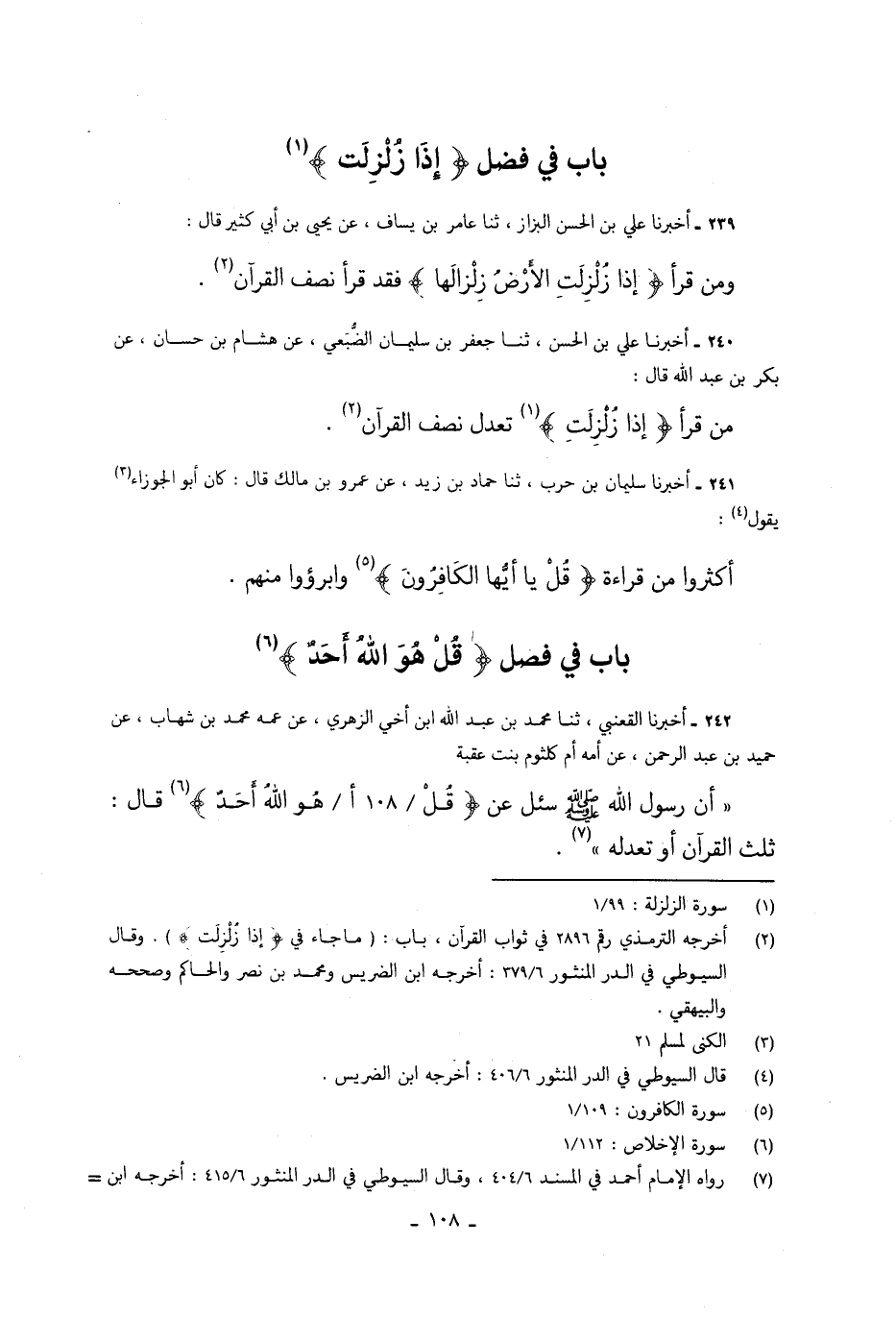 240 - أَخْبَرَنَا عَلِيُّ بْنُ الْحَسَنِ، حَدَّثَنَا جَعْفَرُ بْنُ سُلَيْمَانَ الضُّبَعِيُّ، عَنْ هِشَامِ بْنِ حَسَّانَ، عَنْ بَكْرِ بْنِ عَبْدِ اللَّهِ، قَالَ: «§مَنْ قَرَأَ إِذَا زُلْزِلَتِ تَعْدِلُ نِصْفَ الْقُرْآنِ»