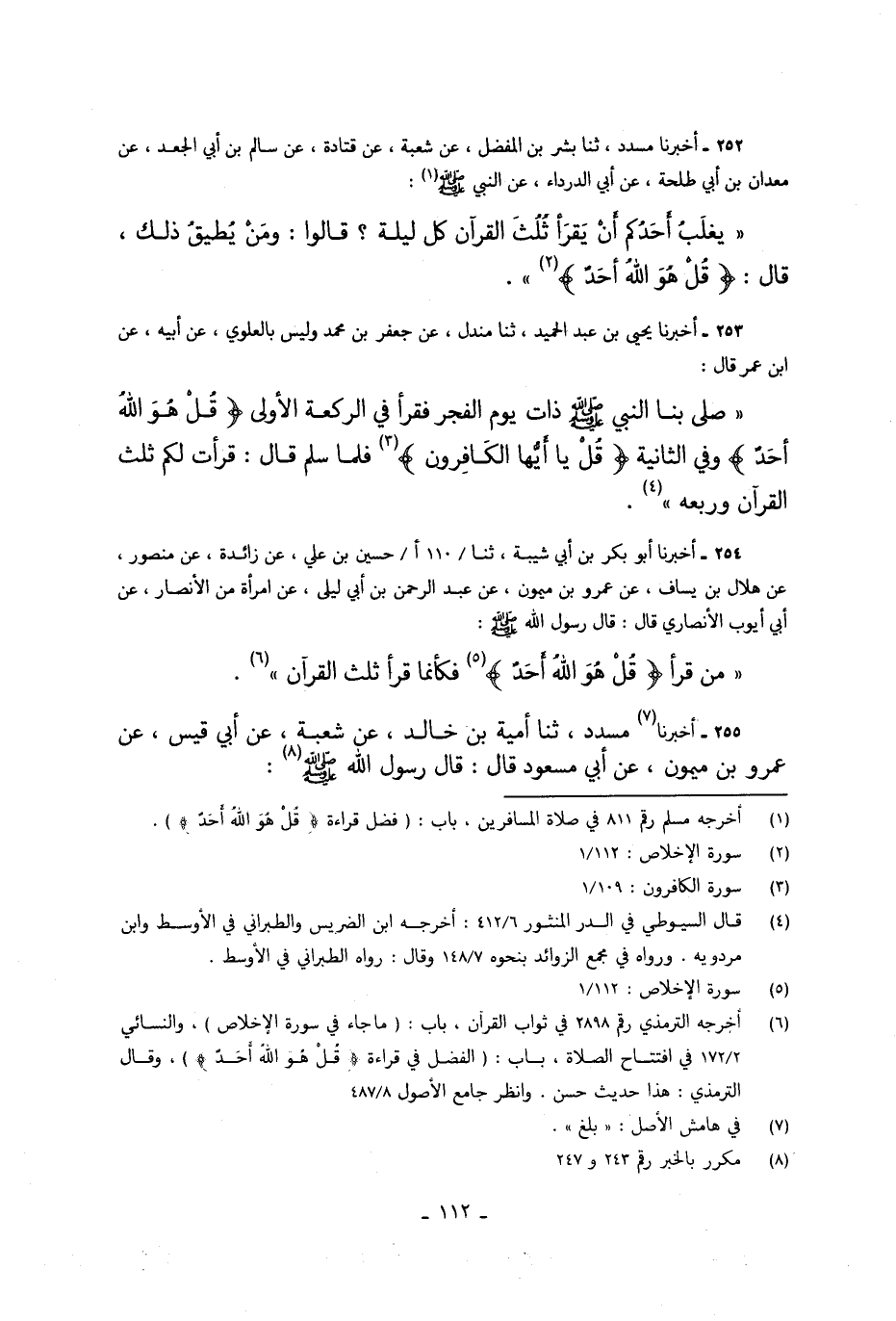 255 - أَخْبَرَنَا مُسَدَّدٌ، حَدَّثَنَا أَحْمَدُ بْنُ خَالِدٍ، عَنْ شُعْبَةَ، عَنْ أَبِي قَيْسٍ، عَنْ عَمْرِو بْنِ مَيْمُونٍ، عَنْ أَبِي مَسْعُودٍ، قَالَ: قَالَ رَسُولُ اللَّهِ صَلَّى اللهُ عَلَيْهِ وَسَلَّمَ: -[113]- «§أَيُغْلَبُ أَحَدُكُمْ أَنْ يَقْرَأَ كُلَّ لَيْلَةٍ، ثُلُثَ الْقُرْآنِ؟» قَالُوا: يَا رَسُولَ اللَّهِ، وَأَيُّنَا يُطِيقُ ذَلِكَ؟ قَالَ: «قُلْ هُوَ اللَّهُ أَحَدٌ»