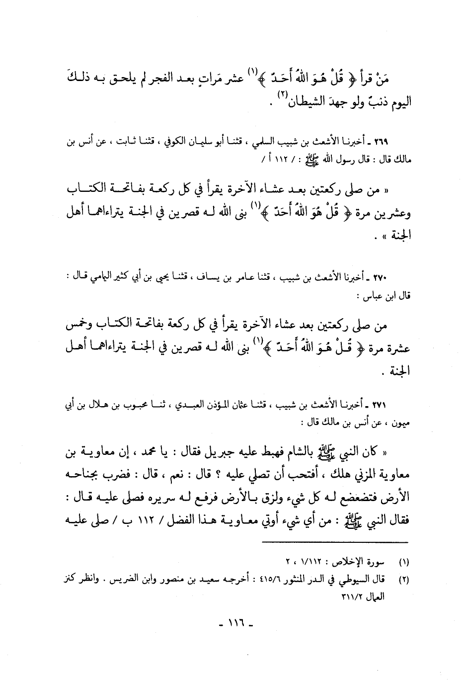 269 - أَخْبَرَنَا الْأَشْعَثُ بْنُ شَبِيبٍ السُّلَمِيُّ، قَالَ: حَدَّثَنَا أَبُو سَلْمَانَ الْكُوفِيُّ، قَالَ: حَدَّثَنَا ثَابِتٌ، عَنْ أَنَسِ بْنِ مَالِكٍ، قَالَ رَسُولُ اللَّهِ صَلَّى اللهُ عَلَيْهِ وَسَلَّمَ: «§مَنْ صَلَّى رَكْعَتَيْنِ بَعْدَ عِشَاءِ الْآخِرَةِ، يَقْرَأُ فِي كُلِّ رَكْعَةٍ بِفَاتِحَةِ الْكِتَابِ وَعِشْرِينَ مَرَّةً قُلْ هُوَ اللَّهُ أَحَدٌ بَنَى اللَّهُ لَهُ قَصْرَيْنِ فِي الْجَنَّةِ يَتَرَاءَاهُمَا أَهْلُ الْجَنَّةِ»