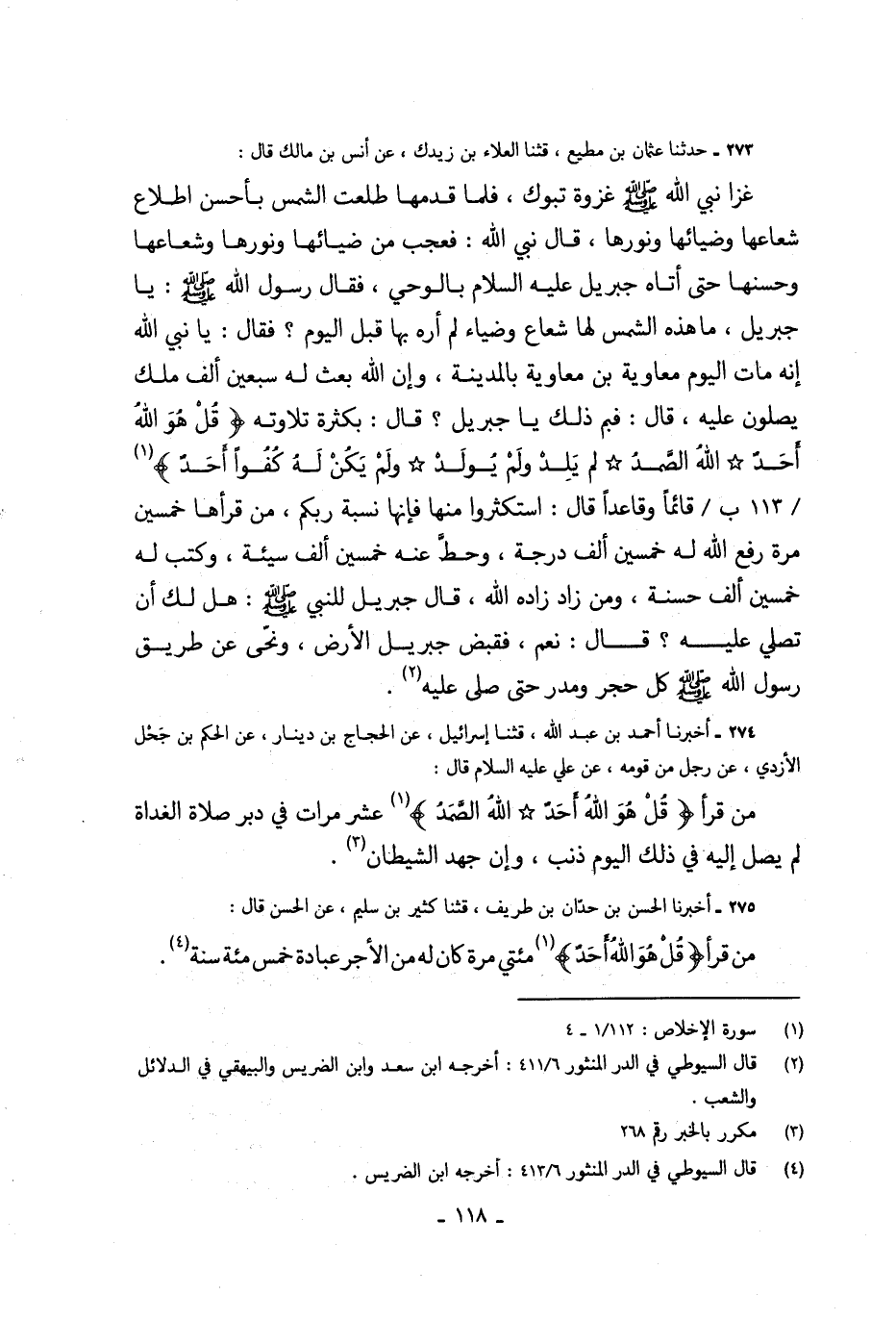 273 - حَدَّثَنَا عُثْمَانُ بْنُ مُطِيعٍ، قَالَ: حَدَّثَنَا الْعَلَاءُ بْنُ زَيْدٍ، عَنْ أَنَسِ بْنِ مَالِكٍ، قَالَ: " §غَزَا نَبِيُّ اللَّهِ صَلَّى اللهُ عَلَيْهِ وَسَلَّمَ غَزْوَةَ تَبُوكَ، فَلَمَّا قَدِمَهَا طَلَعَتِ الشَّمْسُ بِأَحْسَنِ إِطْلَاعِ شُعَاعِهَا، وَضِيَائِهَا، وَنُورِهَا، قَالَ نَبِيُّ اللَّهِ - فَعَجِبَ مِنْ ضِيَائِهَا، وَنُورِهَا، وَشُعَاعِهَا وَحُسْنِهَا حَتَّى أَتَاهُ جِبْرِيلُ عَلَيْهِ السَّلَامُ بِالْوَحْيِ فَقَالَ رَسُولُ اللَّهِ صَلَّى اللهُ عَلَيْهِ وَسَلَّمَ: «يَا جِبْرِيلُ مَا هَذِهِ الشَّمْسُ؟ لَهَا شُعَاعٌ، وَضِيَاءٌ لَمْ أَرَهُ بِهَا قَبْلَ الْيَوْمِ» فَقَالَ: يَا نَبِيَّ اللَّهِ إِنَّهُ مَاتَ الْيَوْمَ مُعَاوِيَةُ بْنُ مُعَاوِيَةَ بِالْمَدِينَةِ، وَإِنَّ اللَّهَ بَعَثَ لَهُ سَبْعِينَ أَلْفِ مَلَكٍ يُصَلُّونَ عَلَيْهِ، قَالَ: «فَبِمَ ذَلِكَ يَا جِبْرِيلُ؟» قَالَ: لِكَثْرَةِ تِلَاوَتِهِ قُلْ هُوَ اللَّهُ أَحَدٌ، اللَّهُ الصَّمَدُ، لَمْ يَلِدْ، وَلَمْ يُولَدْ، وَلَمْ يَكُنْ لَهُ كُفُوًا أَحَدٌ قَائِمًا، وَقَاعِدًا، قَالَ: «اسْتَكْثِرُوا مِنْهَا فَإِنَّهَا نِسْبَةُ رَبِّكُمْ، مَنْ قَرَأَهَا خَمْسِينَ مَرَّةً رَفَعَ اللَّهُ لَهُ خَمْسِينَ أَلْفِ دَرَجَةٍ، وَحَطَّ عَنْهُ خَمْسِينَ أَلْفِ سَيِّئَةٍ، وَكُتِبَ لَهُ خَمْسِينَ أَلْفِ حَسَنَةٍ، وَمَنْ زَادَ زَادَهُ اللَّهُ» قَالَ جِبْرِيلُ لِلنَّبِيِّ صَلَّى اللهُ عَلَيْهِ وَسَلَّمَ: هَلْ لَكَ أَنْ تُصَلِّيَ عَلَيْهِ؟ قَالَ: «نَعَمْ» فَقَبَضَ جِبْرِيلُ الْأَرْضَ، وَنَحَّى عَنْ طَرِيقِ رَسُولِ اللَّهِ صَلَّى اللهُ عَلَيْهِ وَسَلَّمَ كُلَّ حَجَرٍ، وَمَدَرٍ، حَتَّى صَلَّى عَلَيْهِ "