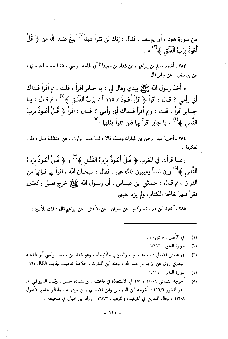 283 - أَخْبَرَنَا مُسْلِمُ بْنُ إِبْرَاهِيمَ، عَنْ شَدَّادِ بْنِ سَعِيدٍ أَبِي طَلْحَةَ الرَّاسِبِيِّ، قَالَ: حَدَّثَنَا سَعِيدٌ الْجُرَيْرِيُّ، عَنْ أَبِي نَضْرَةَ، عَنْ جَابِرٍ، قَالَ: " أَخَذَ رَسُولُ اللَّهِ صَلَّى اللهُ عَلَيْهِ وَسَلَّمَ بِيَدِي وَقَالَ لِي: «يَا جَابِرُ، اقْرَأْ» قُلْتُ: بِمَا أَقْرَأُ فِدَاكَ أَبِي وَأُمِّي؟ قَالَ: «§اقْرَأْ قُلْ أَعُوذُ بِرَبِّ الْفَلَقِ» ثُمَّ قَالَ: «يَا جَابِرُ، اقْرَأْ» قُلْتُ: وَبِمَا أَقْرَأُ فِدَاكَ أَبِي وَأُمِّي؟ قَالَ: " اقْرَأْ: قُلْ أَعُوذُ بِرَبِّ النَّاسِ يَا جَابِرُ، اقْرَأْهُمَا فَلَنْ تَقْرَأَ بِمِثْلِهِمَا "