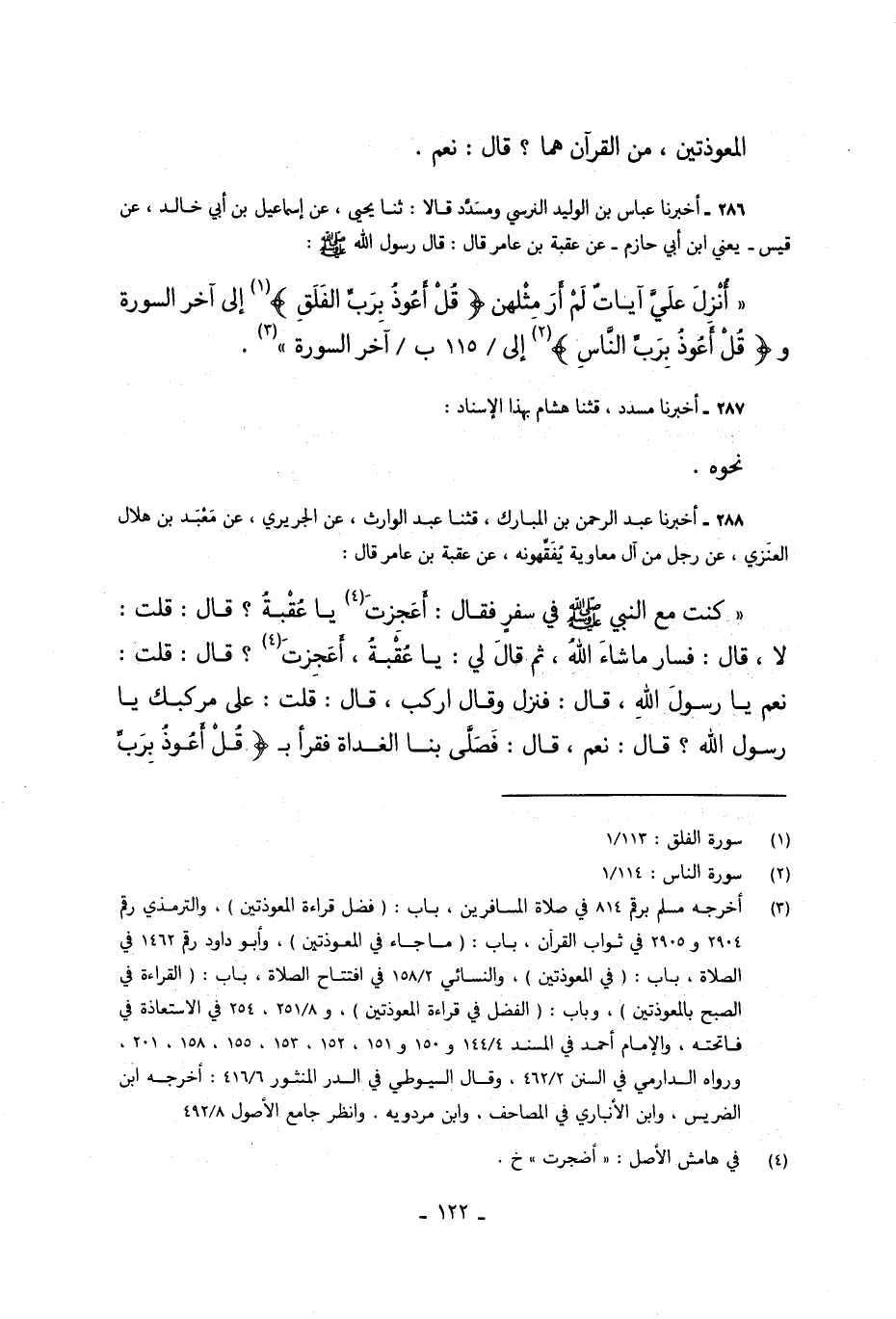 288 - أَخْبَرَنَا عَبْدُ الرَّحْمَنِ بْنُ الْمُبَارَكِ، قَالَ: حَدَّثَنَا عَبْدُ الْوَارِثِ، عَنِ الْجُرَيْرِيِّ، عَنْ مَعْبَدِ بْنِ هِلَالٍ الْعَنَزِيِّ، عَنْ رَجُلٍ مِنْ آلِ مُعَاوِيَةَ يَفْقَهُونَهُ عَنْ عُقْبَةَ بْنِ عَامِرٍ، قَالَ: " كُنْتُ مَعَ النَّبِيِّ صَلَّى اللهُ عَلَيْهِ وَسَلَّمَ فِي سَفَرٍ، فَقَالَ: «§أَعَجَزْتَ يَا عُقْبَةُ» ؟ قَالَ: قُلْتُ: لَا. قَالَ: فَسَارَ مَا شَاءَ اللَّهُ، ثُمَّ قَالَ لِي: «يَا عُقْبَةُ أَعَجَزْتَ؟» قَالَ: قُلْتُ: نَعَمْ يَا رَسُولَ اللَّهِ، قَالَ: فَنَزَلَ وَقَالَ: «ارْكَبْ» قَالَ: قُلْتُ: عَلَى مَرْكَبِكَ يَا رَسُولَ اللَّهِ؟ قَالَ: «نَعَمْ» قَالَ: فَصَلَّى بِنَا الْغَدَاةَ، فَقَرَأَ بِقُلْ أَعُوذُ بِرَبِّ -[123]- الْفَلَقِ، وَقُلْ أَعُوذُ بِرَبِّ النَّاسِ، فَلَمَّا سَلَّمَ أَقْبَلَ عَلَيَّ فَقَالَ: «أَسَمِعْتَ يَا عُقْبَةُ؟ يَا عُقْبَةُ أَسَمِعْتَ؟»