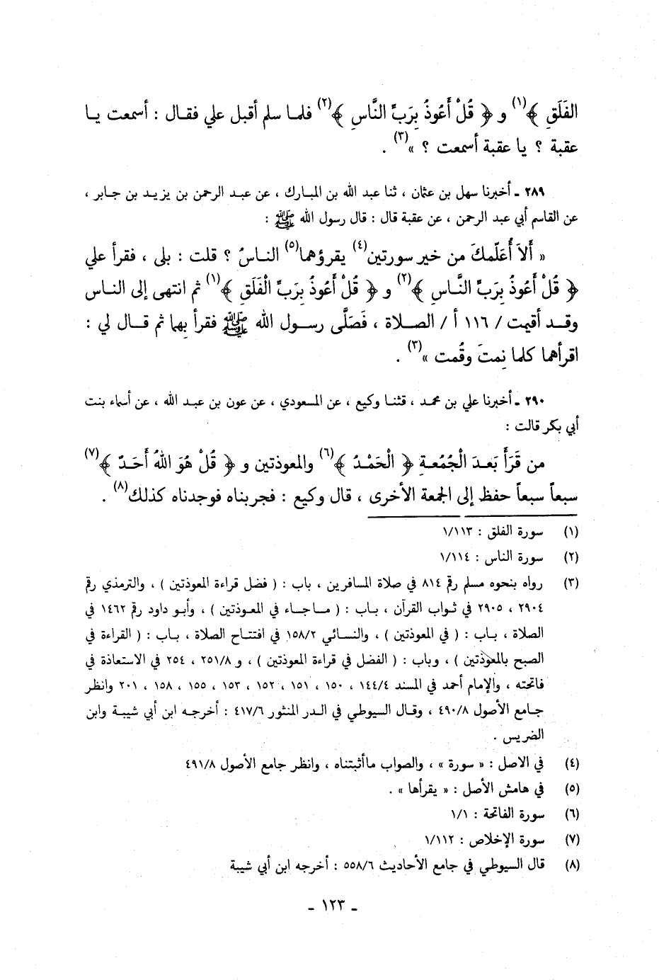 289 - أَخْبَرَنَا سَهْلُ بْنُ عُثْمَانَ، حَدَّثَنَا عَبْدُ اللَّهِ بْنُ الْمُبَارَكِ، عَنْ عَبْدِ الرَّحْمَنِ بْنِ يَزِيدَ بْنِ جَابِرٍ، عَنِ الْقَاسِمِ أَبِي عَبْدِ الرَّحْمَنِ، عَنْ عُقْبَةَ، قَالَ: قَالَ رَسُولُ اللَّهِ صَلَّى اللهُ عَلَيْهِ وَسَلَّمَ: «§أَلَا أُعَلِّمُكَ مِنْ خَيْرِ سُورَةٍ يَقْرَؤُهَا النَّاسُ؟» قُلْتُ: بَلَى، فَقَرَأَ عَلَيَّ: قُلْ أَعُوذُ بِرَبِّ النَّاسِ وَقُلْ أَعُوذُ بِرَبِّ الْفَلَقِ ثُمَّ انْتَهَى إِلَى النَّاسِ، وَقَدْ أُقِيمَتِ الصَّلَاةُ فَصَلَّى رَسُولُ اللَّهِ صَلَّى اللهُ عَلَيْهِ وَسَلَّمَ، فَقَرَأَ بِهِمَا، ثُمَّ قَالَ لِي: اقْرَأْهُمَا كُلَّمَا نِمْتَ وَقُمْتَ "
