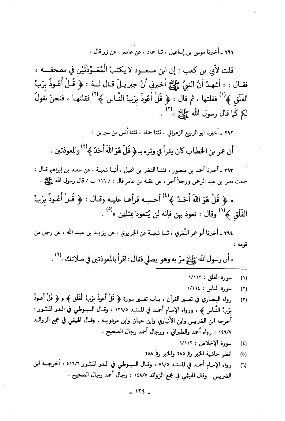 291 - أَخْبَرَنَا مُوسَى بْنُ إِسْمَاعِيلَ، حَدَّثَنَا حَمَّادٌ، عَنْ عَاصِمٍ، عَنْ زِرٍّ، قَالَ: " قُلْتُ لِأُبَيِّ بْنِ كَعْبٍ: إِنَّ ابْنَ مَسْعُودٍ، لَا يَكْتُبُ الْمُعَوِّذَتَيْنِ فِي مُصْحَفِهِ. فَقَالَ: §أَشْهَدُ أَنَّ النَّبِيَّ صَلَّى اللهُ عَلَيْهِ وَسَلَّمَ: أَخْبَرَنِي: أَنَّ جِبْرِيلَ قَالَ لَهُ: «قُلْ أَعُوذُ بِرَبِّ الْفَلَقِ» فَقُلْتُهَا ثُمَّ قَالَ: قُلْ أَعُوذُ بِرَبِّ النَّاسِ فَقُلْتُهَا. فَنَحْنُ نَقُولُ لَكُمْ كَمَا قَالَ رَسُولُ اللَّهِ صَلَّى اللهُ عَلَيْهِ وَسَلَّمَ "