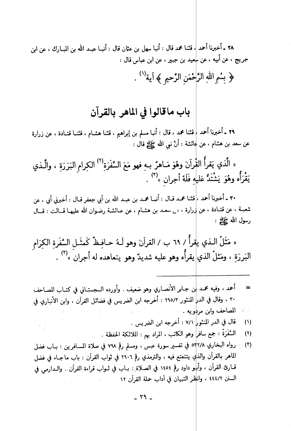 29 - أَخْبَرَنَا أَحْمَدُ، قَالَ: حَدَّثَنَا مُحَمَّدٌ، قَالَ: أَخْبَرَنَا مُسْلِمُ بْنُ إِبْرَاهِيمَ، قَالَ: حَدَّثَنَا هِشَامٌ، قَالَ: حَدَّثَنَا قَتَادَةُ، عَنْ زُرَارَةَ، عَنْ سَعْدِ بْنِ هِشَامٍ، عَنْ عَائِشَةَ: " أَنَّ النَّبِيَّ صَلَّى اللهُ عَلَيْهِ وَسَلَّمَ قَالَ: «§الَّذِي يَقْرَأُ الْقُرْآنَ وَهُوَ مَاهِرٌ بِهِ، فَهُوَ مَعَ السَّفَرَةِ الْكِرَامِ الْبَرَرَةِ، وَالَّذِي يَشْتَدُّ عَلَيْهِ فَلَهُ أَجْرَانِ»
