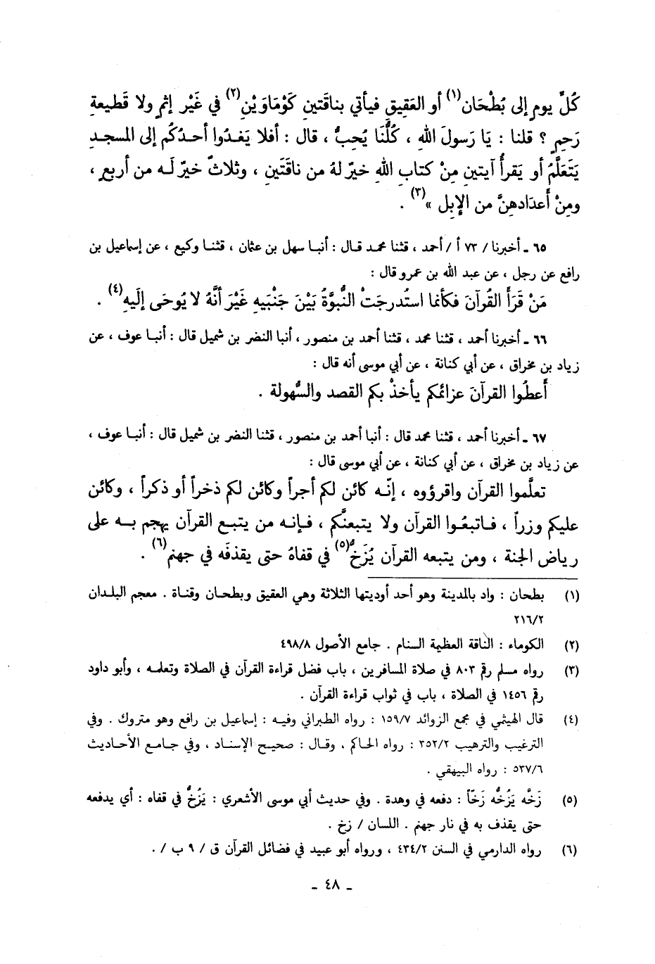67 - أَخْبَرَنَا أَحْمَدُ، قَالَ: حَدَّثَنَا مُحَمَّدٌ، قَالَ: أَخْبَرَنَا أَحْمَدُ بْنُ مَنْصُورٍ، قَالَ النَّضْرُ بْنُ شُمَيْلٍ: قَالَ: أَخْبَرَنَا عَوْفٌ، عَنْ زِيَادِ بْنِ مِخْرَاقٍ، عَنْ أَبِي كِنَانَةَ، عَنْ أَبِي مُوسَى، أَنَّهُ قَالَ: «§تَعَلَّمُوا الْقُرْآنَ وَاقْرَءُوهُ، إِنَّهُ كَائِنٌ لَكُمْ أَجْرًا، وَكَائِنٌ لَكُمْ ذُخْرًا، أَوْ ذِكْرًا، وَكَائِنٌ عَلَيْكُمْ وِزْرًا، فَاتَّبِعُوا الْقُرْآنَ يَتَّبِعْكُمْ، فَإِنَّ مَنْ يَتْبَعِ الْقُرْآنَ يَهْجُمْ بِهِ عَلَى رِيَاضِ الْجَنَّةِ، وَمَنْ يَتْبَعُهُ الْقُرْآنُ زَخَّ فِي قَفَاهُ حَتَّى يَقْذِفَهُ فِي جَهَنَّمَ»