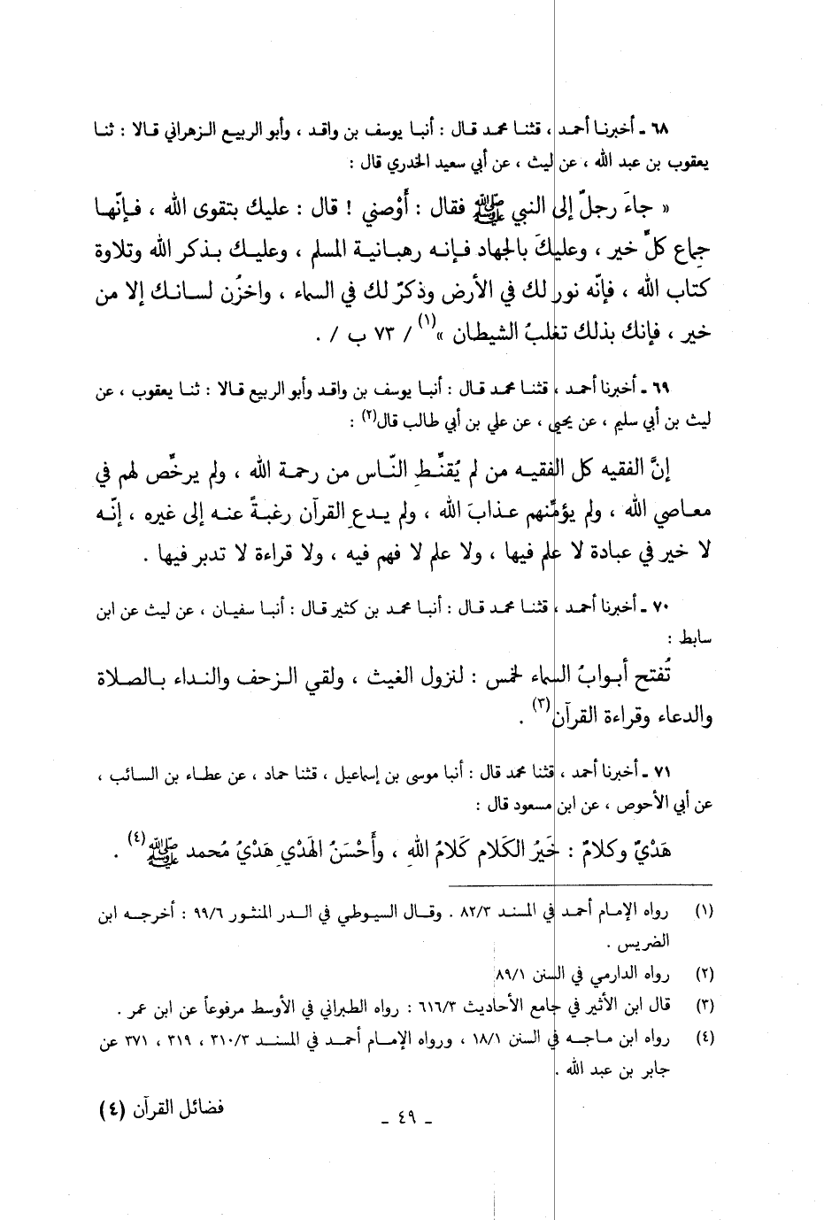 68 - أَخْبَرَنَا أَحْمَدُ، قَالَ: حَدَّثَنَا مُحَمَّدٌ، قَالَ: أَخْبَرَنَا يُوسُفُ بْنُ وَاقِدٍ، وَأَبُو الرَّبِيعِ الزَّهْرَانِيُّ، قَالَا: حَدَّثَنَا يَعْقُوبُ بْنُ عَبْدِ اللَّهِ، عَنْ لَيْثٍ، عَنْ أَبِي سَعِيدِ الْخُدْرِيِّ، قَالَ: " جَاءَ رَجُلٌ إِلَى النَّبِيِّ صَلَّى اللهُ عَلَيْهِ وَسَلَّمَ فَقَالَ: أَوْصِنِي. قَالَ: «§عَلَيْكَ بِتَقْوَى اللَّهِ، فَإِنَّهَا جِمَاعُ كُلِّ خَيْرٍ، وَعَلَيْكَ بِالْجِهَادِ، فَإِنَّهَا رَهْبَانِيَّةُ الْمُسْلِمِ، وَعَلَيْكَ بِذِكْرِ اللَّهِ، وَتِلَاوَةِ كِتَابِ اللَّهِ فَإِنَّهُ نُورٌ لَكَ فِي الْأَرْضِ، وَذِكْرٌ لَكَ فِي السَّمَاءِ، وَاخْزِنْ لِسَانَكَ إِلَّا مِنْ خَيْرٍ، فَإِنَّكَ بِذَلِكَ تَغْلِبُ الشَّيْطَانَ»