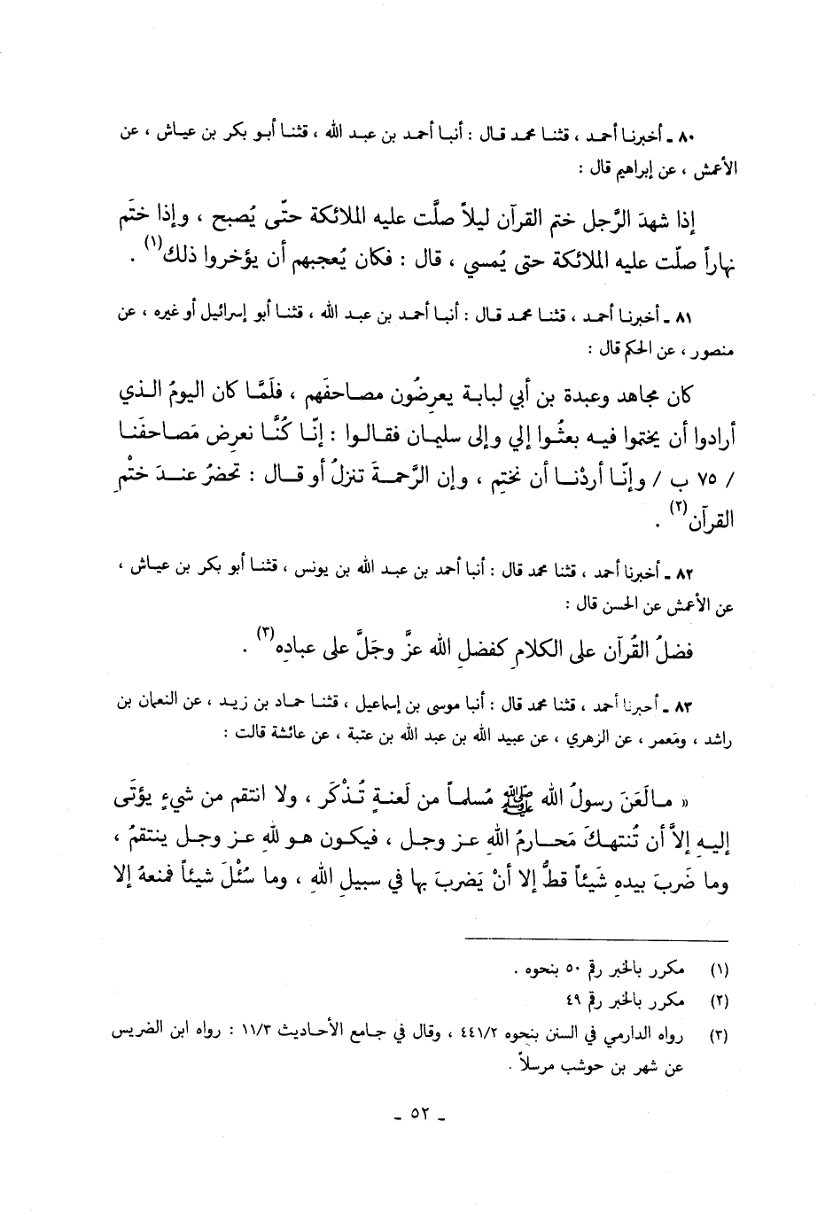 81 - أَخْبَرَنَا أَحْمَدُ، قَالَ: حَدَّثَنَا مُحَمَّدٌ، قَالَ: أَخْبَرَنَا أَحْمَدُ بْنُ عَبْدِ اللَّهِ، قَالَ: حَدَّثَنَا أَبُو إِسْرَائِيلَ، أَوْ غَيْرُهُ، عَنْ مَنْصُورٍ، عَنِ الْحَكَمِ، قَالَ: كَانَ مُجَاهِدٌ، وَعَبْدَةُ بْنُ أَبِي لُبَابَةَ يَعْرِضُونَ مَصَاحِفَهُمْ فَلَمَّا كَانَ الْيَوْمُ الَّذِي أَرَادُوا أَنْ يَخْتِمُوا فِيهِ، بَعَثُوا إِلَيَّ وَإِلَى سُلَيْمَانَ فَقَالُوا: §إِنَّا كُنَّا نَعْرِضُ مَصَاحِفَنَا وَإِنَّا أَرَدْنَا أَنْ نَخْتِمَ، وَإِنَّ الرَّحْمَةَ تَنْزِلُ أَوْ قَالَ تَحْضُرُهُ عِنْدَ خَتْمِ الْقُرْآنِ "