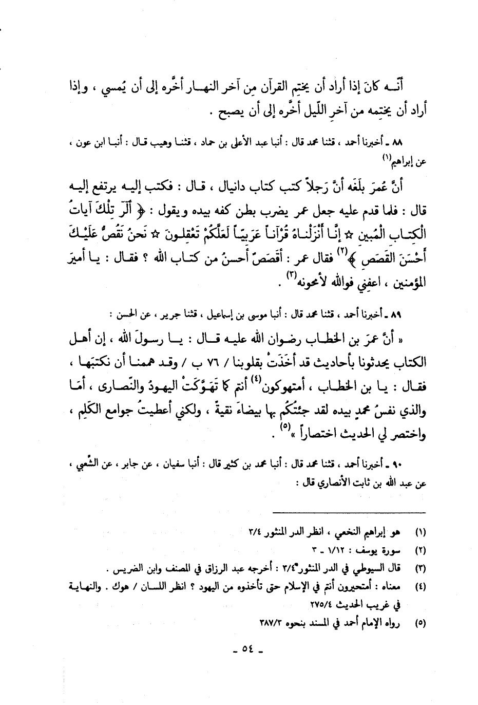 88 - أَخْبَرَنَا أَحْمَدُ، قَالَ: حَدَّثَنَا مُحَمَّدٌ، قَالَ: أَخْبَرَنَا عَبْدُ الْأَعْلَى بْنُ حَمَّادٍ، قَالَ: حَدَّثَنَا وُهَيْبٌ، قَالَ: أَخْبَرَنَا ابْنُ عَوْنٍ عَنْ إِبْرَاهِيمَ أَنَّ عُمَرَ، بَلَغَهُ أَنَّ رَجُلًا، كَتَبَ كِتَابَ دَانْيَالَ َالَ: " فَكَتَبَ إِلَيْهِ لِيَرْتَفِعَ إِلَيْهِ قَالَ: فَلَمَّا قَدِمَ عَلَيْهِ، جَعَلَ عُمَرُ يَضْرِبُ بَطْنَ كَفِّهِ بِيَدِهِ وَيَقُولُ: {§الر تِلْكَ آيَاتُ الْكِتَابِ الْمُبِينِ إِنَّا أَنْزَلْنَاهُ قُرْآنًا عَرَبِيًّا لَعَلَّكُمْ تَعْقِلُونَ نَحْنُ نَقُصُّ عَلَيْكَ أَحْسَنَ الْقَصَصِ} [يوسف: 2] فَقَالَ عُمَرُ: أَقَصَصٌ أَحْسَنُ مِنْ كِتَابِ اللَّهِ؟ فَقَالَ: يَا أَمِيرَ الْمُؤْمِنِينَ، أَعْفِنِي فَوَاللَّهِ لَأَمْحُوَنَّهُ "