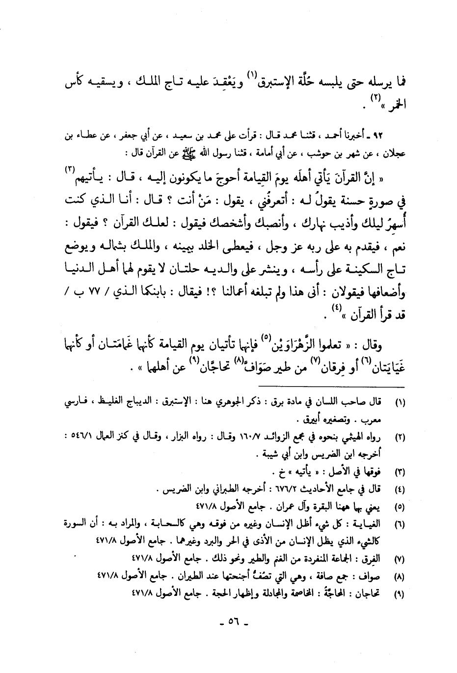 92 - قَرَأْتُ عَلَى مُحَمَّدِ بْنِ سَعِيدٍ، عَنْ أَبِي جَعْفَرٍ، عَنْ عَطَاءِ بْنِ عَجْلَانَ، عَنْ شَهْرِ بْنِ حَوْشَبٍ، عَنْ أَبِي أُمَامَةَ، قَالَ: حَدَّثَنَا رَسُولُ اللَّهِ صَلَّى اللهُ عَلَيْهِ وَسَلَّمَ عَنِ الْقُرْآنِ، قَالَ: «§إِنَّ الْقُرْآنَ يَأْتِي أَهْلَهُ يَوْمَ الْقِيَامَةِ أَحْوَجُ مَا يَكُونُونَ إِلَيْهِ» قَالَ: " يَأْتِيهِمْ فِي صُورَةٍ حَسَنَةٍ يَقُولُ لَهُ: أَتَعْرِفُنِي؟ يَقُولُ: مَنْ أَنْتَ؟ قَالَ: أَنَا الَّذِي كُنْتُ أُسْهِرُ لَيْلَكَ، وَأُذِيبُ نَهَارَكَ، وَأُنْصِبُكَ، وَأُشْخِصُكَ. فَيَقُولُ: لَعَلَّكَ الْقُرْآنُ؟ فَيَقُولُ: نَعَمْ. فَيَقْدَمُ بِهِ عَلَى رَبِّهِ عَزَّ وَجَلَّ فَيُعْطَى الْخُلْدَ بِيَمِينِهِ، وَالْمُلْكَ بِشِمَالِهِ، وَيُوضَعُ تَاجُ السَّكِينَةِ عَلَى رَأْسِهِ، وَيُنْشَرُ عَلَى وَالِدَيْهِ حُلَّتَانِ، لَا يَقُومُ لَهُمَا أَهْلُ الدُّنْيَا وَأَضْعَافُهُمَا، فَيَقُولَانِ: أَنَّى هَذَا وَلَمْ تَبْلُغْهُ أَعْمَالُنَا؟ فَيُقَالُ: بِابْنِكُمَا الَّذِي قَدْ قَرَأَ الْقُرْآنَ " وَقَالَ: «تَعَلَّمُوا الزَّهْرَاوَيْنِ فَإِنَّهُمَا يَأْتِيَانِ يَوْمَ الْقِيَامَةِ كَأَنَّهُمَا غَمَامَتَانِ، أَوْ كَأَنَّهُمَا غَيَايَتَانِ، أَوْ فِرْقَانِ مِنْ طَيْرٍ صَوَافَّ يَتَحَاجَّانِ عَنْ أَهْلِهَا» -[57]- وَقَالَ «تَعَلَّمُوا الْبَقَرَةَ، فَإِنَّ أَخْذَهَا بَرَكَةٌ، وَتَرْكَهَا حَسْرَةٌ، وَلَا يَسْتَطِيعُهَا الْبَطَلَةُ» يَعْنِي السَّحَرَةَ قَالَ: «لِمَنْ قَرَأَ الْقُرْآنَ، وَلَمْ يَغُلَّ فِيهِ وَلَمْ يَحِفْ عَنْهُ، وَلَمْ يَتَكَثَّرْ بِهِ، وَلَمْ يَسْتَأْكِلْ بِهِ»