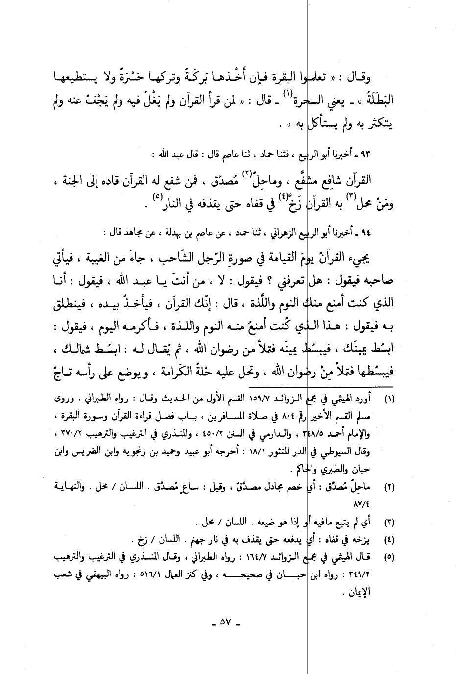 93 - أَخْبَرَنَا أَبُو الرَّبِيعِ، حَدَّثَنَا حَمَّادٌ، حَدَّثَنَا عَاصِمٌ، قَالَ: قَالَ عَبْدُ اللَّهِ: «§إِنَّ الْقُرْآنَ شَافِعٌ مُشَفَّعٌ، وَمَاحِلٌ مُصَدِّقٌ فَمَنْ شَفَعَ لَهُ الْقُرْآنُ قَادَهُ إِلَى الْجَنَّةِ، وَمَنْ مَحِلَ بِهِ الْقُرْآنُ زُخَّ فِي قَفَاهُ حَتَّى يَقْذِفَهُ فِي النَّارِ»