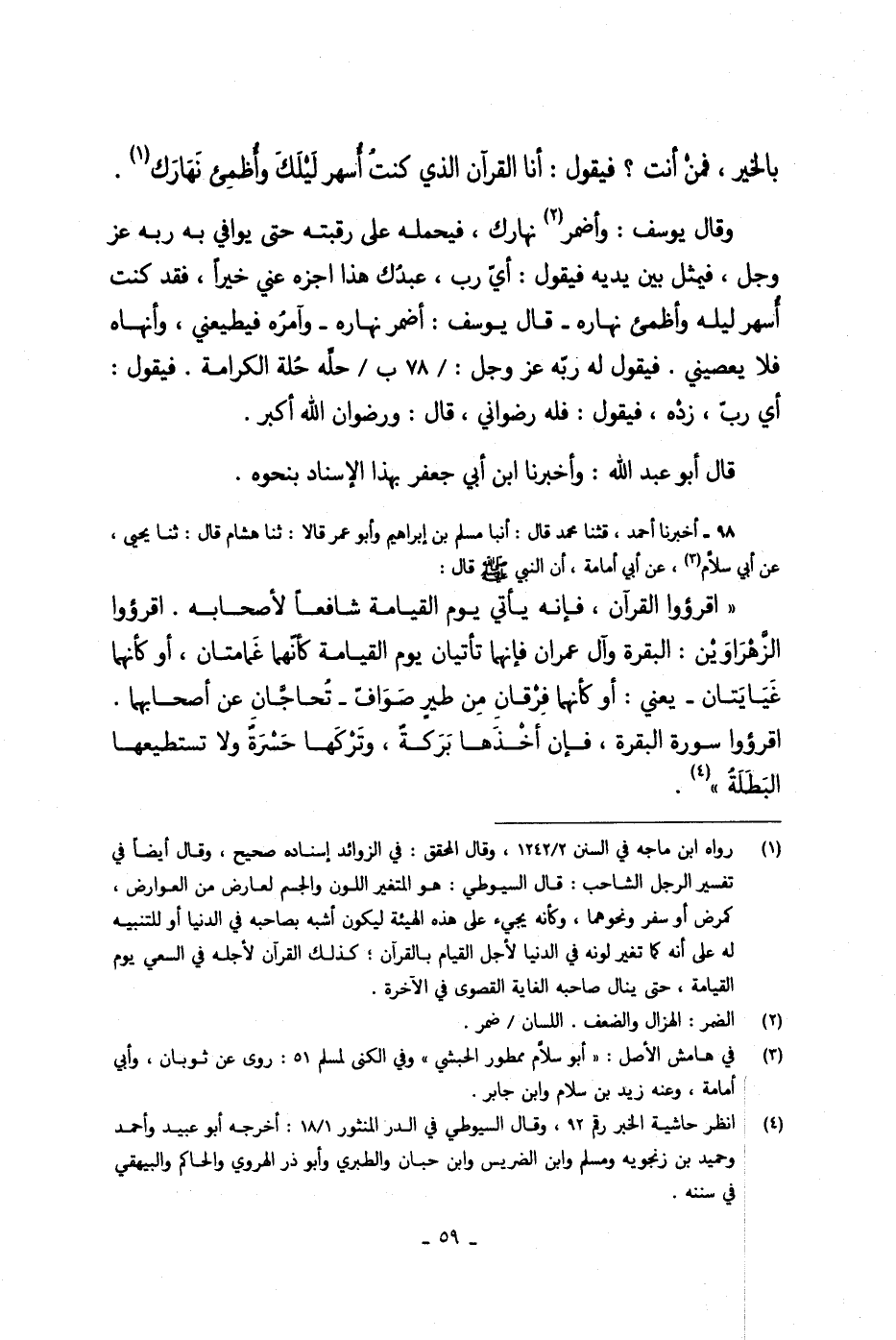 98 - أَخْبَرَنَا أَحْمَدُ، قَالَ: حَدَّثَنَا مُحَمَّدٌ، قَالَ: أَخْبَرَنَا مُسْلِمُ بْنُ إِبْرَاهِيمَ، وَأَبُو عُمَرَ، قَالَا: حَدَّثَنَا هِشَامٌ، قَالَ: حَدَّثَنَا يَحْيَى، عَنْ أَبِي سَلَّامٍ، عَنْ أَبِي أُمَامَةَ،: أَنَّ النَّبِيَّ صَلَّى اللهُ عَلَيْهِ وَسَلَّمَ قَالَ: " §اقْرَأُوا الْقُرْآنَ فَإِنَّهُ يَأْتِي يَوْمَ الْقِيَامَةِ شَافِعًا لِأَصْحَابِهِ اقْرَأُوا الزَّهْرَاوَيْنِ: الْبَقَرَةَ وَآلَ عِمْرَانَ فَإِنَّهُمَا يَأْتِيَانِ يَوْمَ الْقِيَامَةِ كَأَنَّهُمَا غَمَامَتَانِ، أَوْ كَأَنَّهُمَا غَيَايَتَانِ يَعْنِي أَوْ كَأَنَّهُمَا فِرْقَانِ مِنْ طَيْرٍ صَوَافٍّ تُحَاجَّانِ عَنْ أَصْحَابِهِمَا، اقْرَأُوا سُورَةَ الْبَقَرَةِ فَإِنَّ أَخْذَهَا بَرَكَةٌ وَتَرْكَهَا حَسْرَةٌ، وَلَا تَسْتَطِيعُهَا الْبَطَلَةُ "