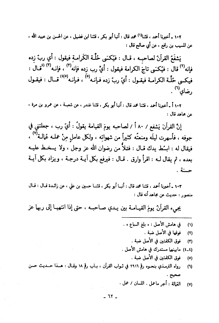 102 - أَخْبَرَنَا أَحْمَدُ، قَالَ: حَدَّثَنَا مُحَمَّدٌ، قَالَ: أَخْبَرَنَا أَبُو بَكْرٍ، قَالَ: حَدَّثَنَا ابْنُ فُضَيْلٍ، عَنِ الْحَسَنِ بْنِ عُبَيْدِ اللَّهِ، عَنِ الْمُسَيَّبِ بْنِ رَافِعٍ، عَنْ أَبِي صَالِحٍ، قَالَ: " §يَشْفَعُ الْقُرْآنُ لِصَاحِبِهِ قَالَ: فَيُكْسَى حُلَّةَ الْكَرَامَةِ فَيَقُولُ: أَيْ رَبِّ، زِدْهُ؛ فَإِنَّهُ. قَالَ: فَيُكْسَى تَاجَ الْكَرَامَةِ فَيَقُولُ: أَيْ رَبِّ زِدْهُ؛ فَإِنَّهُ، فَإِنَّهُ. قَالَ: فَيُكْسَى حُلَّةَ الْكَرَامَةِ. فَيَقُولُ: أَيْ رَبِّ، زِدْهُ؛ فَإِنَّهُ، فَإِنَّهُ. قَالَ: فَيَقُولُ: رِضَايَ "