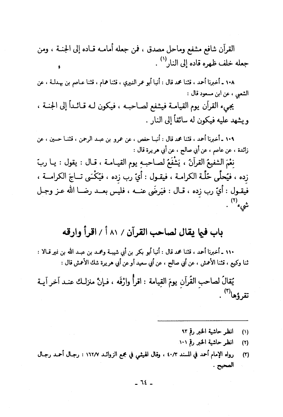 108 - أَخْبَرَنَا أَحْمَدُ، قَالَ: حَدَّثَنَا مُحَمَّدٌ، قَالَ: أَخْبَرَنَا أَبُو عُمَرَ النَّمَرِيُّ، قَالَ: حَدَّثَنَا هَمَّامٌ، قَالَ: حَدَّثَنَا عَاصِمُ بْنُ بَهْدَلَةَ، عَنِ الشَّعْبِيِّ، عَنِ ابْنِ مَسْعُودٍ، قَالَ: «§يَجِيءُ الْقُرْآنُ يَوْمَ الْقِيَامَةِ، فَيَشْفَعُ لِصَاحِبِهِ، فَيَكُونُ لَهُ قَائِدًا إِلَى الْجَنَّةِ، وَيَشْهَدُ عَلَيْهِ فَيَكُونُ لَهُ سَائِقًا إِلَى النَّارِ»
