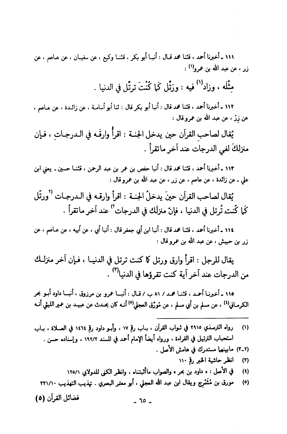113 - أَخْبَرَنَا أَحْمَدُ، قَالَ: حَدَّثَنَا مُحَمَّدٌ، قَالَ: أَخْبَرَنَا حَفْصُ بْنُ عُمَرَ بْنِ عَبْدِ الرَّحْمَنِ، قَالَ: حَدَّثَنَا حُسَيْنٌ يَعْنِي ابْنُ عَلِيٍّ عَنْ زَائِدَةَ، عَنْ عَاصِمٍ، عَنْ زِرٍّ، عَنْ عَبْدِ اللَّهِ بْنِ عَمْرٍو، قَالَ: " §يُقَالُ لِصَاحِبِ الْقُرْآنِ حِينَ يَدْخُلُ الْجَنَّةَ: اقْرَأْ وَارْقَهْ فِي الدَّرَجَاتِ، وَرَتِّلْ كَمَا كُنْتَ تُرَتِّلُ فِي الدُّنْيَا؛ فَإِنَّ مَنْزِلَكَ فِي الدَّرَجَاتِ عِنْدَ آخِرِ مَا تَقْرَأُ "