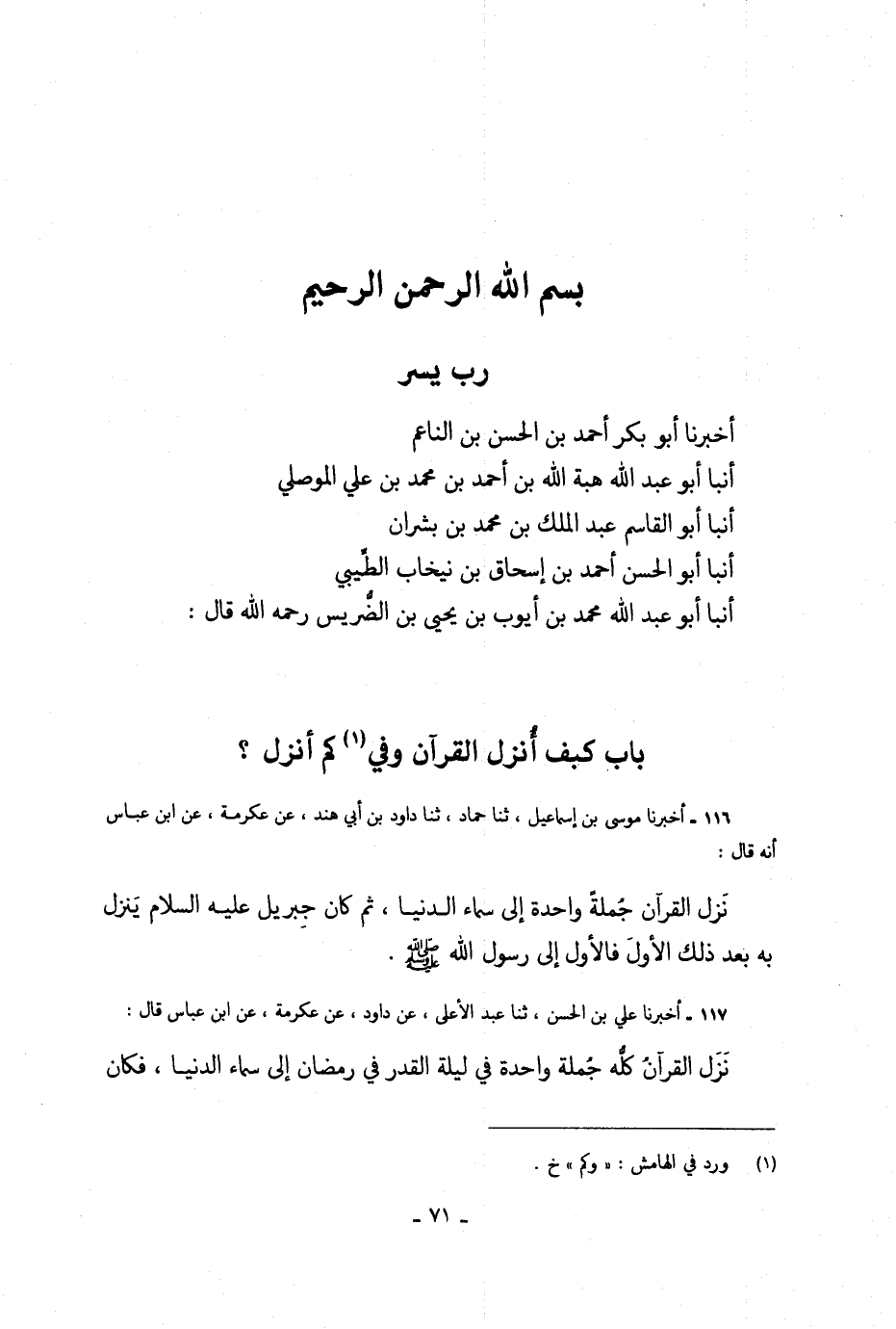 116 - أَخْبَرَنَا مُوسَى بْنُ إِسْمَاعِيلَ، حَدَّثَنَا حَمَّادٌ، حَدَّثَنَا دَاوُدُ بْنُ أَبِي هِنْدَ، عَنْ عِكْرِمَةَ، عَنِ ابْنِ عَبَّاسٍ: أَنَّهُ قَالَ: «§نَزَلَ الْقُرْآنُ جُمْلَةً وَاحِدَةً إِلَى سَمَاءِ الدُّنْيَا، ثُمَّ كَانَ جِبْرِيلُ عَلَيْهِ السَّلَامُ يَنْزِلُ بِهِ بَعْدَ ذَلِكَ الْأَوَّلُ فَالْأَوَّلُ إِلَى رَسُولِ اللَّهِ صَلَّى اللهُ عَلَيْهِ وَسَلَّمَ»