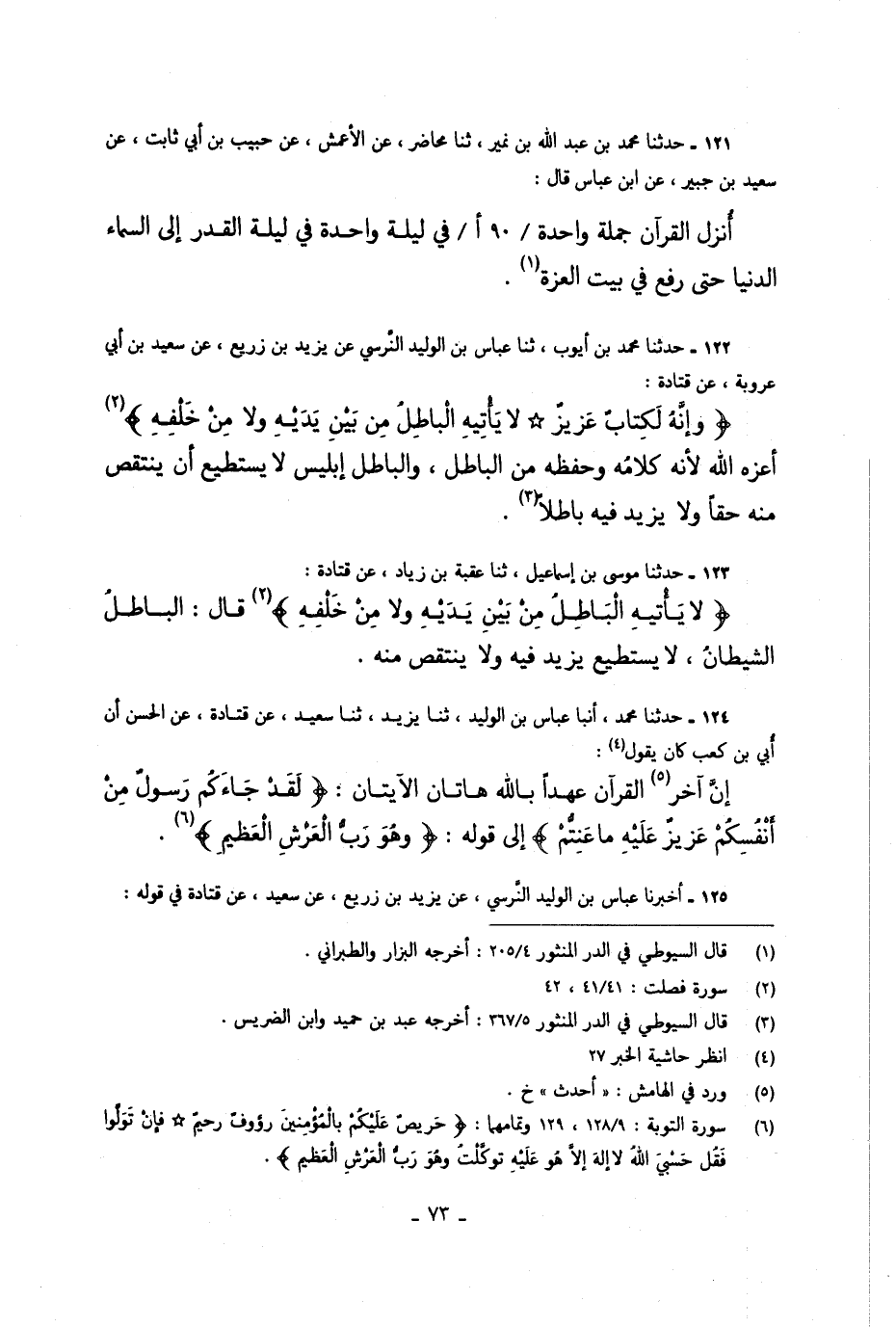 125 - أَخْبَرَنَا عَبَّاسُ بْنُ الْوَلِيدِ النَّرْسِيُّ، عَنْ يَزِيدَ بْنِ زُرَيْعٍ، عَنْ سَعِيدٍ، عَنْ قَتَادَةَ: " فِي قَوْلِهِ تَعَالَى: -[74]- {§وَقُرْآنًا فَرَقْنَاهُ لِتَقْرَأَهُ عَلَى النَّاسِ عَلَى مُكْثٍ وَنَزَّلْنَاهُ تَنْزِيلًا} [الإسراء: 106] «لَمْ يَنْزِلْ فِي لَيْلَةٍ، وَلَا لَيْلَتَيْنِ، وَلَا شَهْرٍ، وَلَا شَهْرَيْنِ، وَلَا سَنَةٍ، وَلَا سَنَتَيْنِ، كَانَ بَيْنَ أَوَّلِهِ وَآخِرِهِ عِشْرُونَ سَنَةً وَلَمَّا شَاءَ اللَّهُ فِي ذَلِكَ»