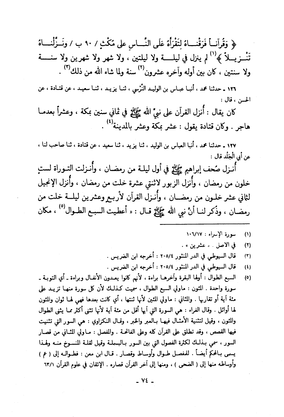 126 - حَدَّثَنَا مُحَمَّدٌ، أَخْبَرَنَا عَبَّاسُ بْنُ الْوَلِيدِ النَّرْسِيُّ، حَدَّثَنَا يَزِيدُ، قَالَ: حَدَّثَنَا سَعِيدٌ، عَنْ قَتَادَةَ، عَنِ الْحَسَنِ، قَالَ: " كَانَ يُقَالُ: " §أُنْزِلَ الْقُرْآنُ عَلَى نَبِيِّ اللَّهِ صَلَّى اللهُ عَلَيْهِ وَسَلَّمَ فِي ثَمَانِ سِنِينَ بِمَكَّةَ وَعَشْرًا بَعْدَ مَا هَاجَرَ، وَكَانَ قَتَادَةُ يَقُولُ: عَشْرٌ بِمَكَّةَ وَعَشْرٌ بِالْمَدِينَةِ "